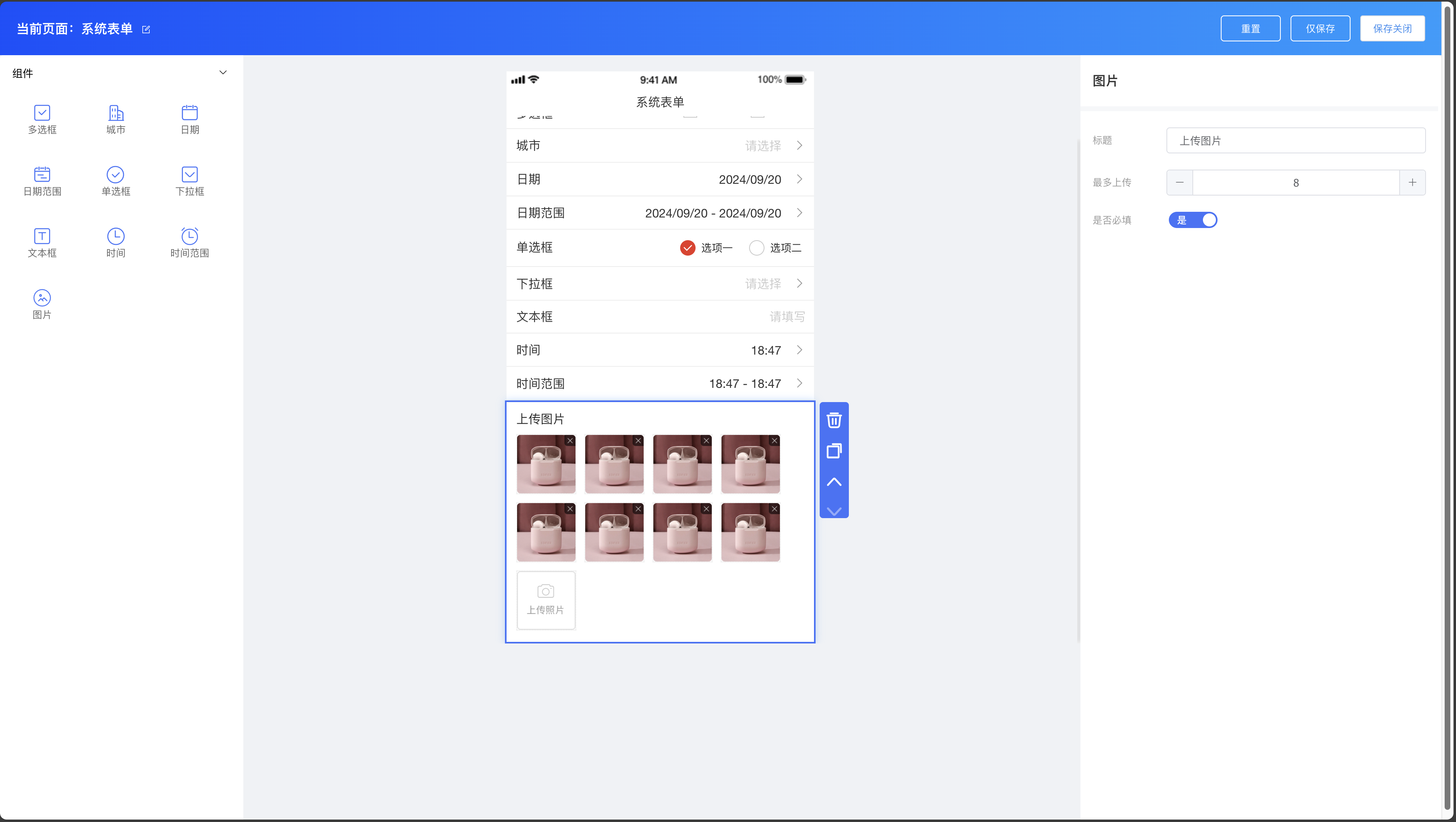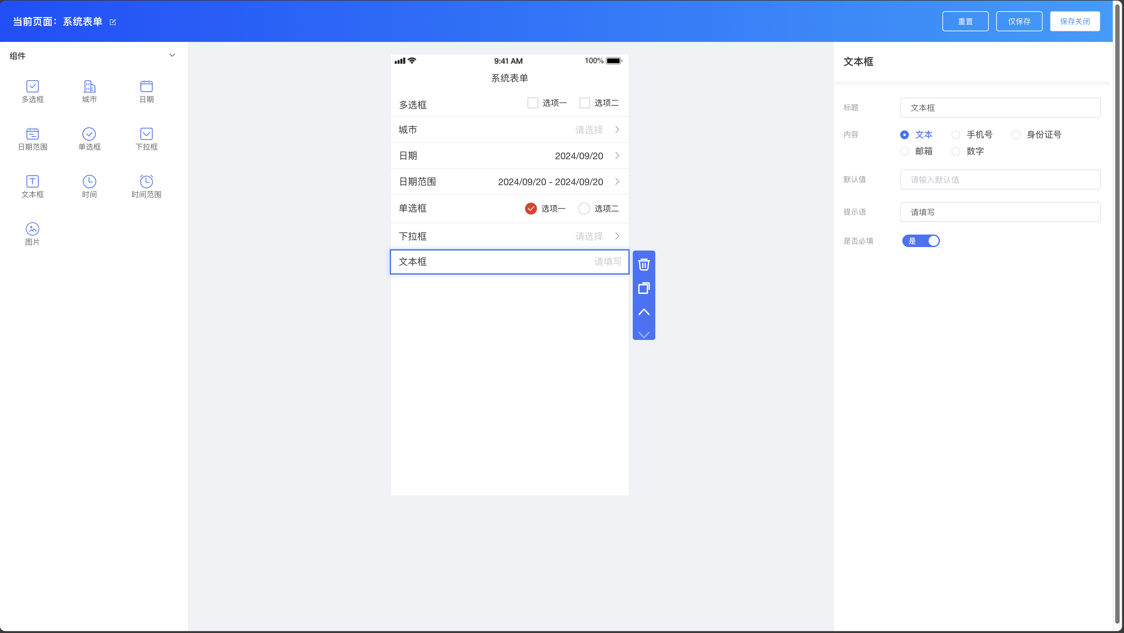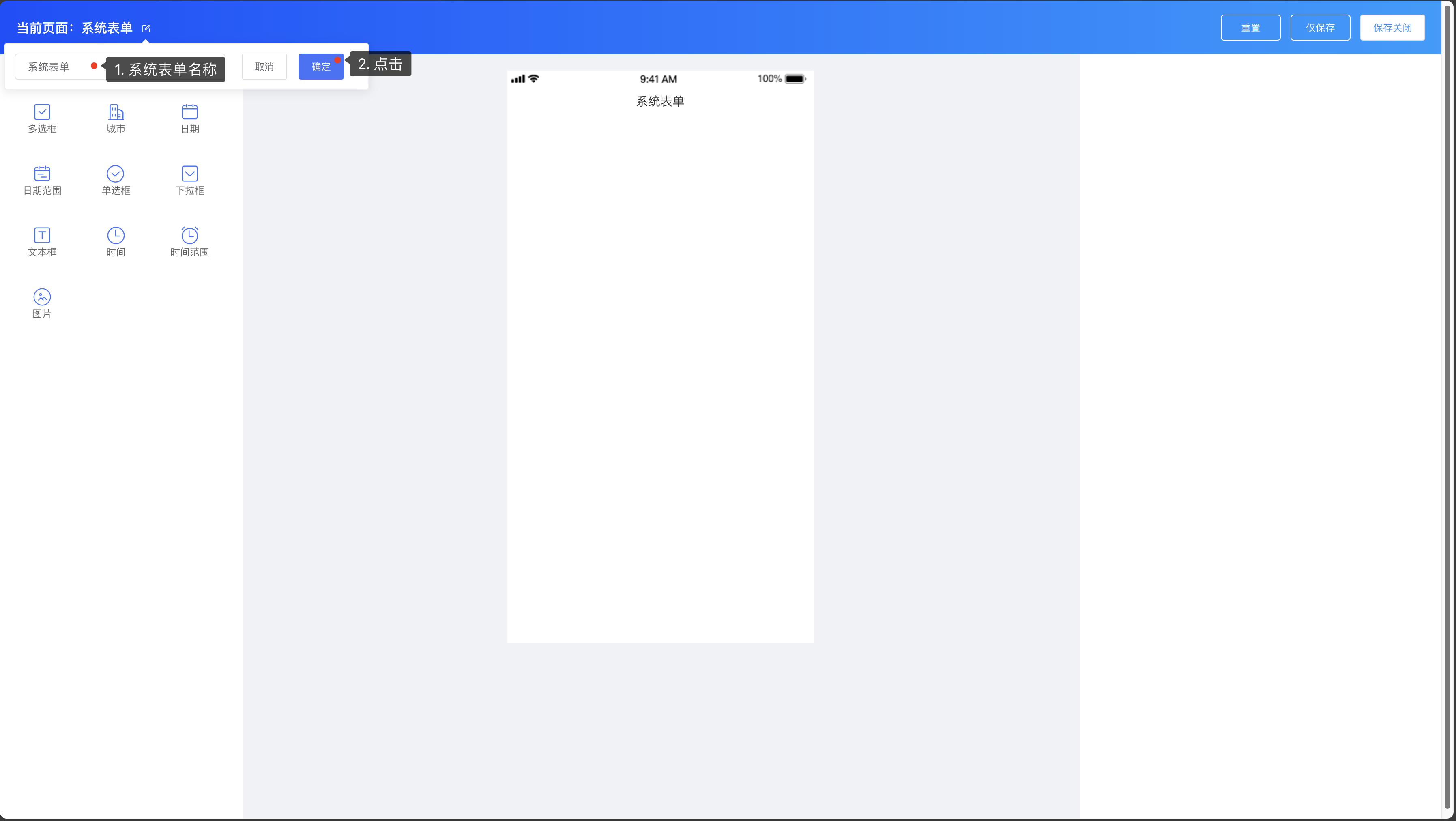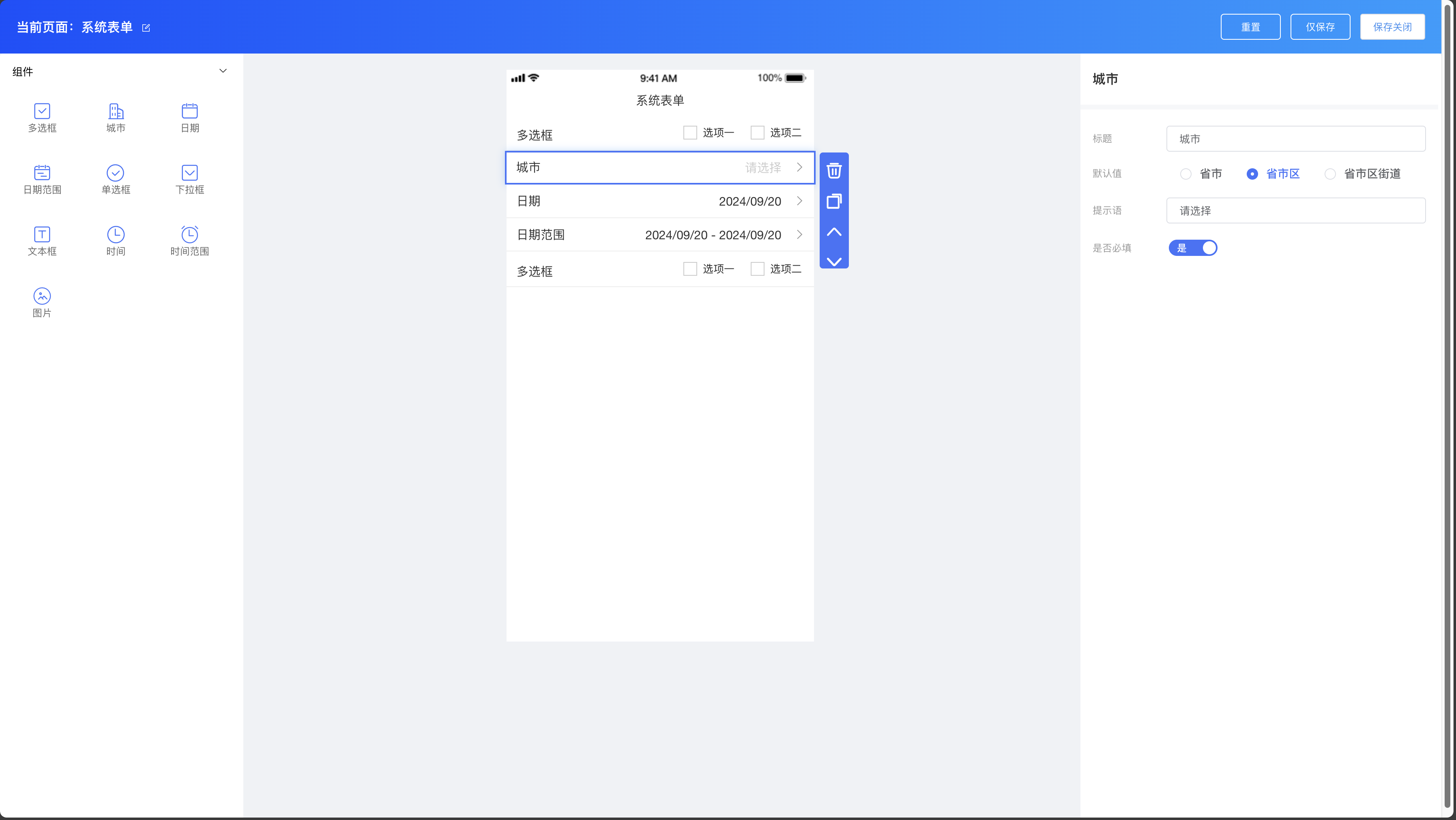 系统表单组件:多选框、城市、日期、日期范围、单选框、下拉框、文本框、时间、时间范围、图片