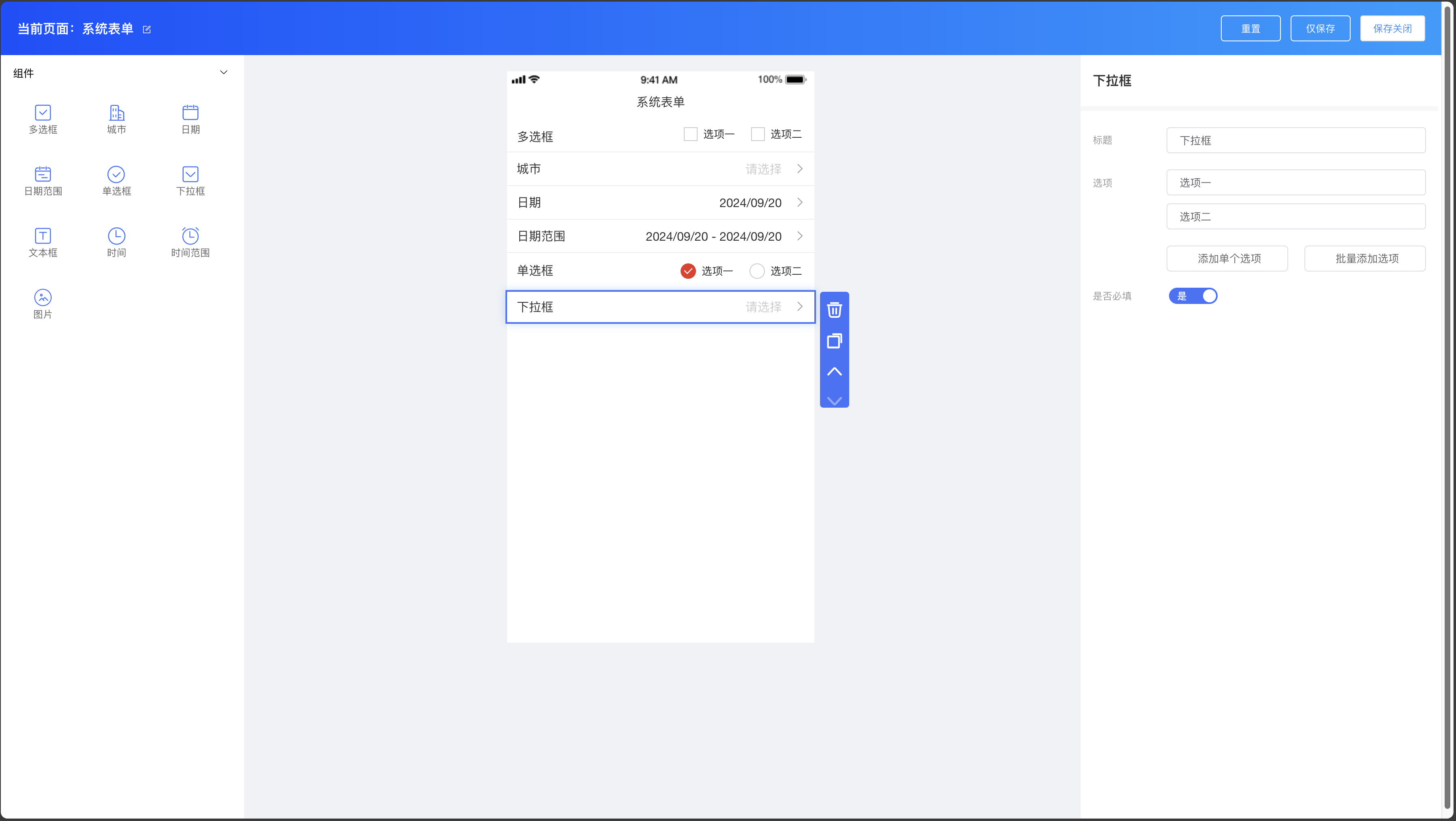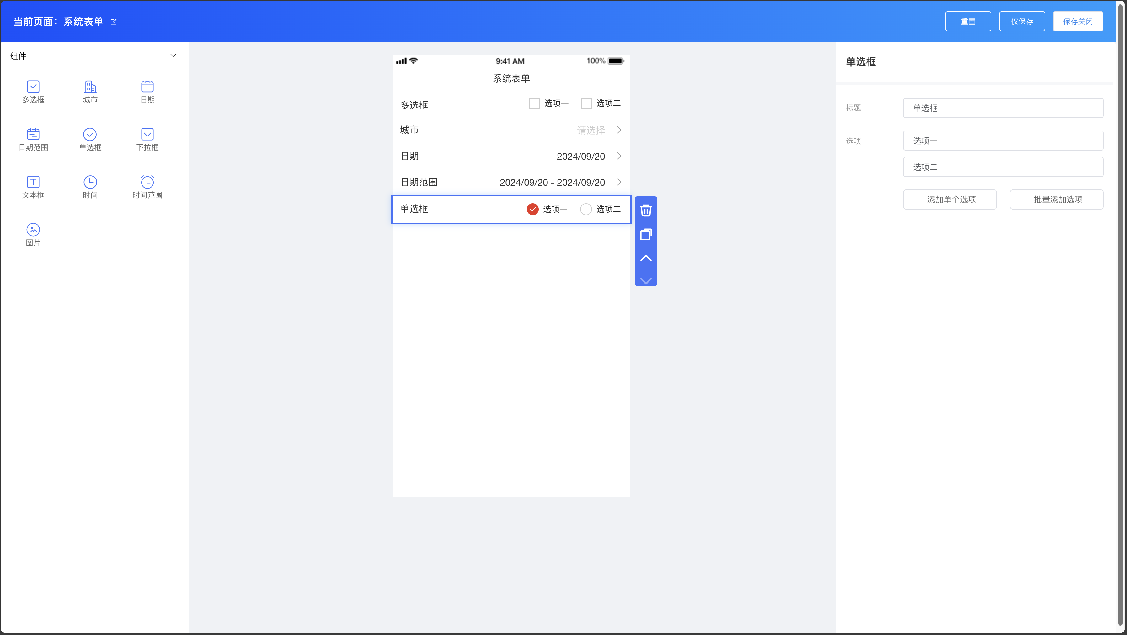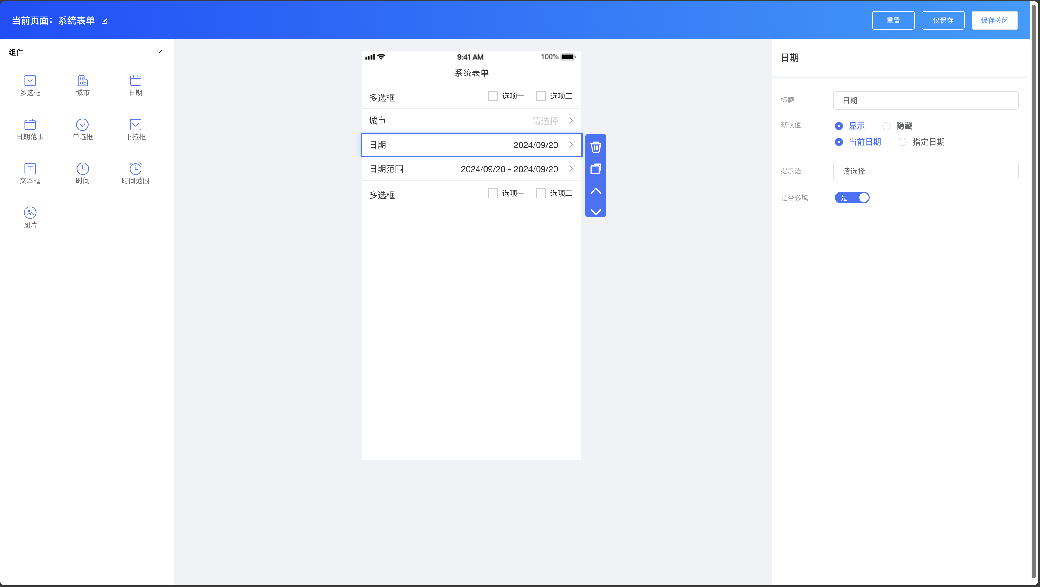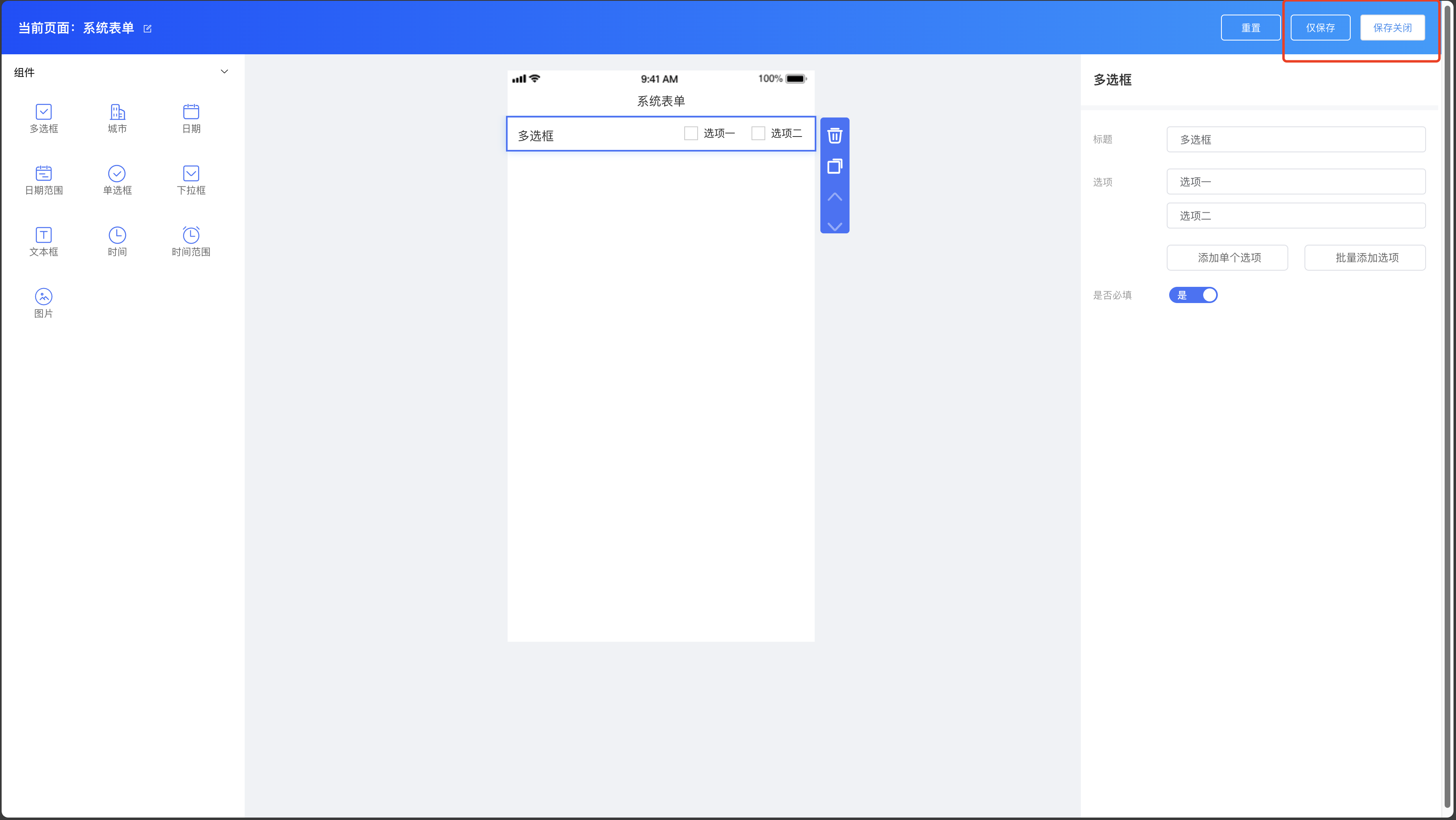 系统表单组件:多选框、城市、日期、日期范围、单选框、下拉框、文本框、时间、时间范围、图片