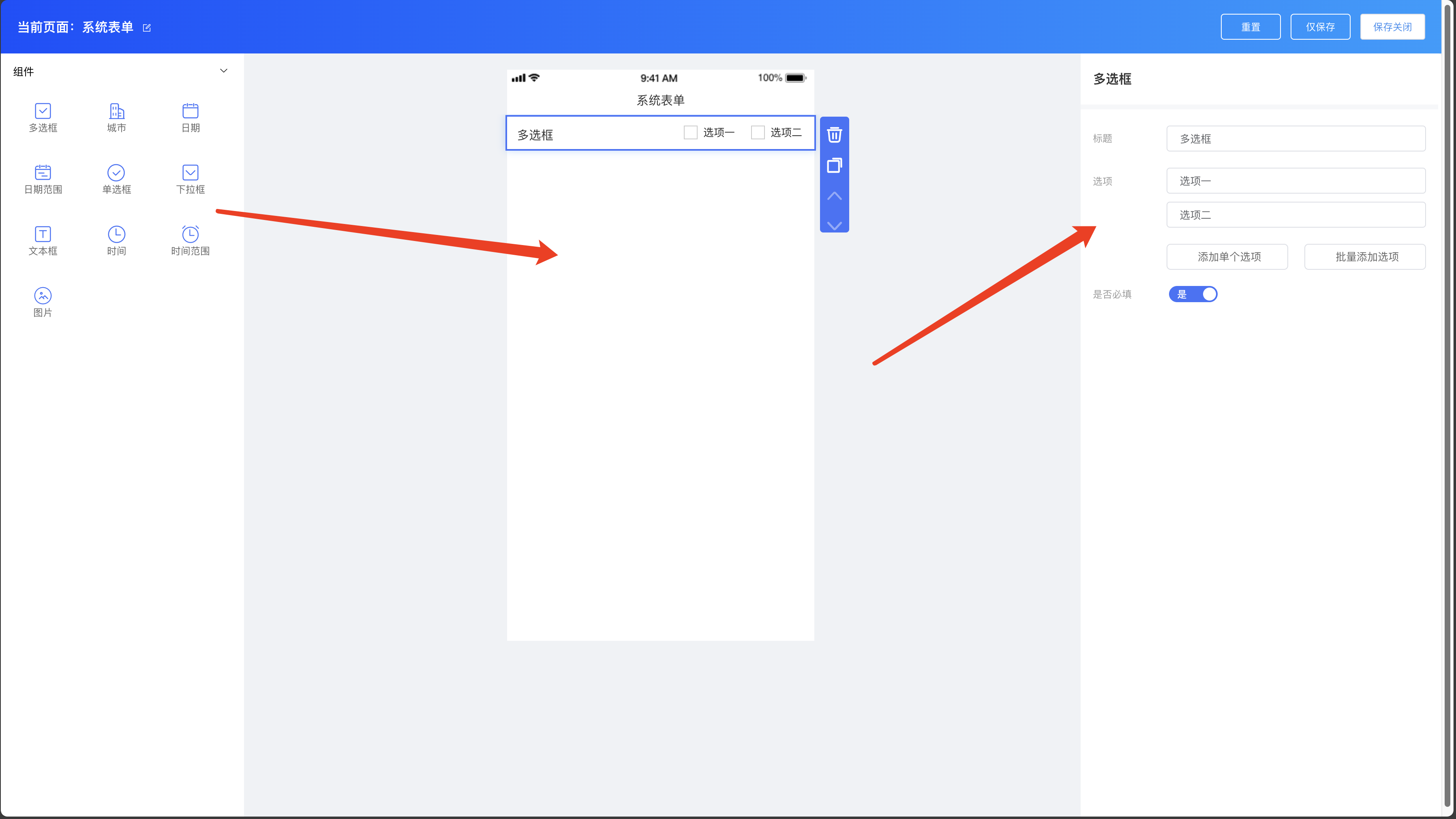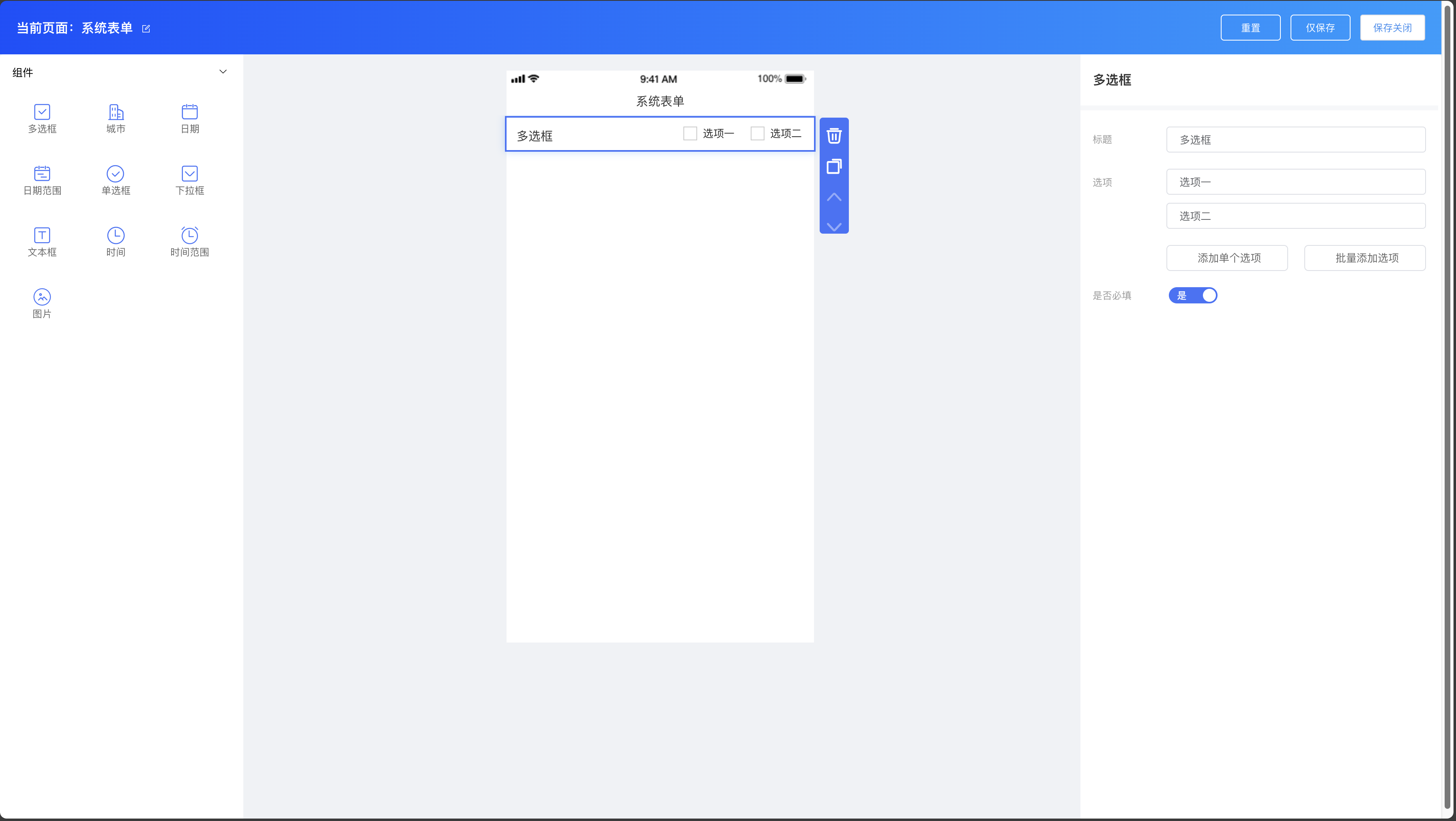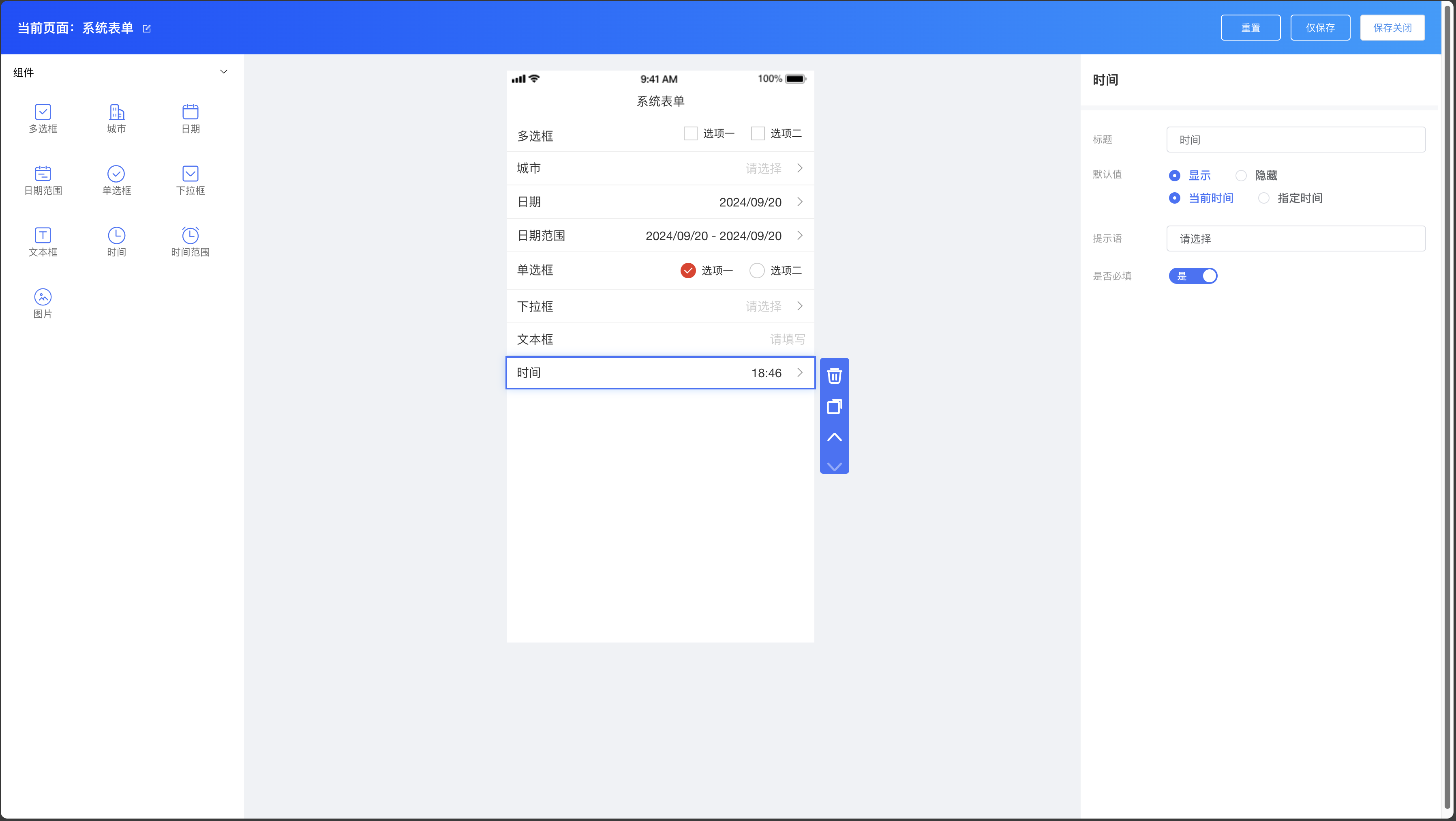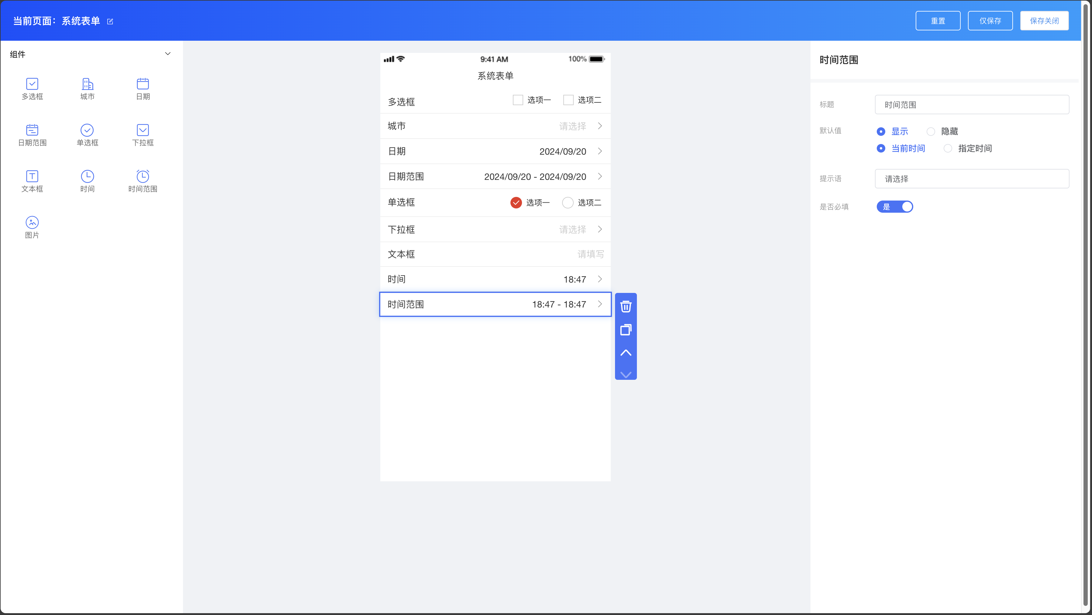 系统表单组件:多选框、城市、日期、日期范围、单选框、下拉框、文本框、时间、时间范围、图片