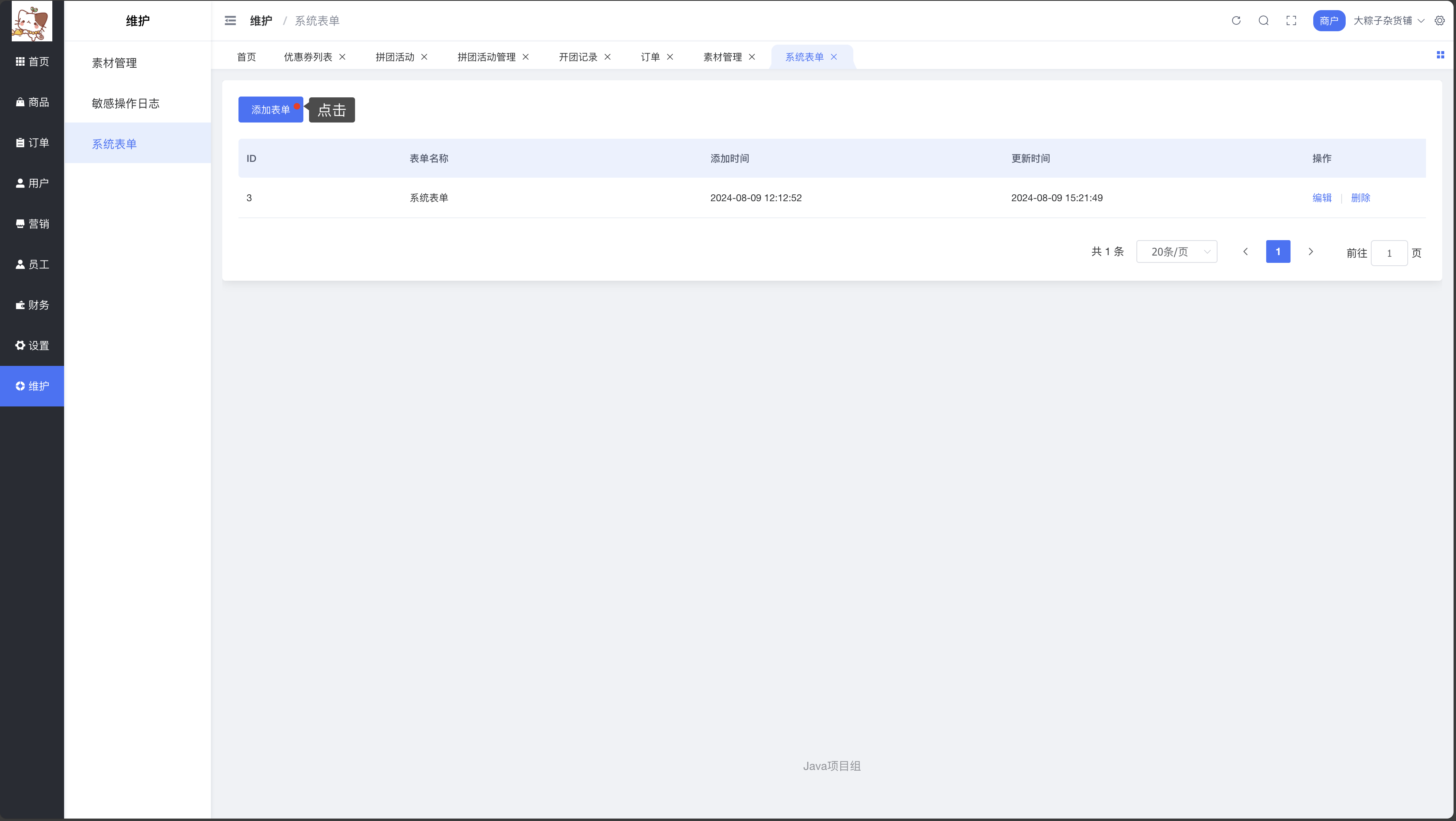 操作页面路径:商家端 > 维护 > 系统表单