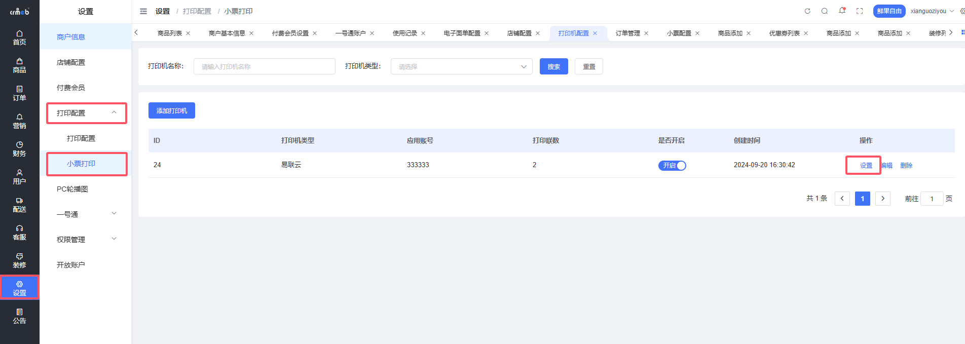位置:商户后台>设置>打印机配置