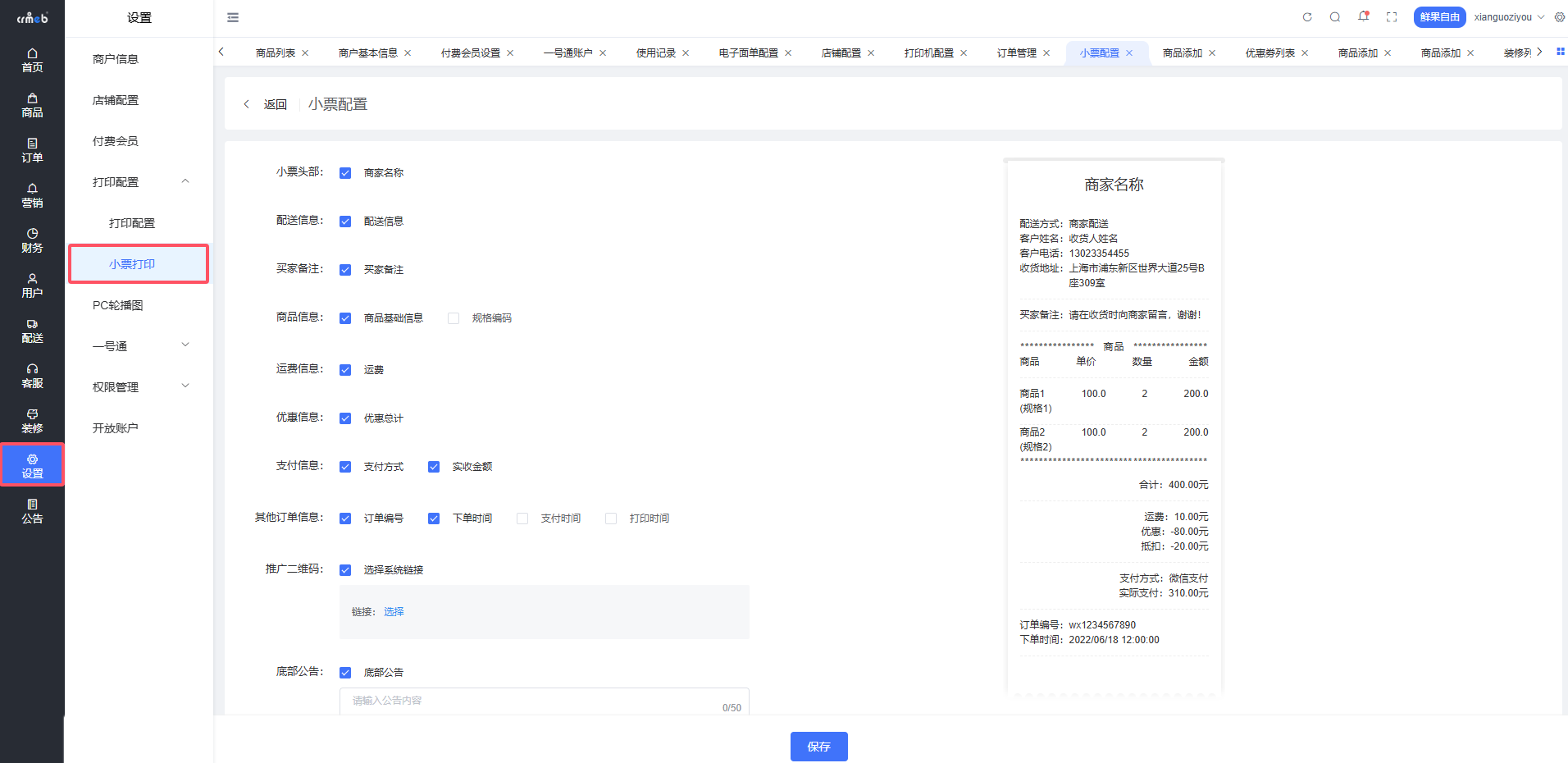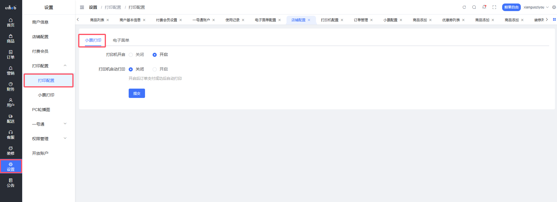位置:商户后台>设置>打印配置>小票打印