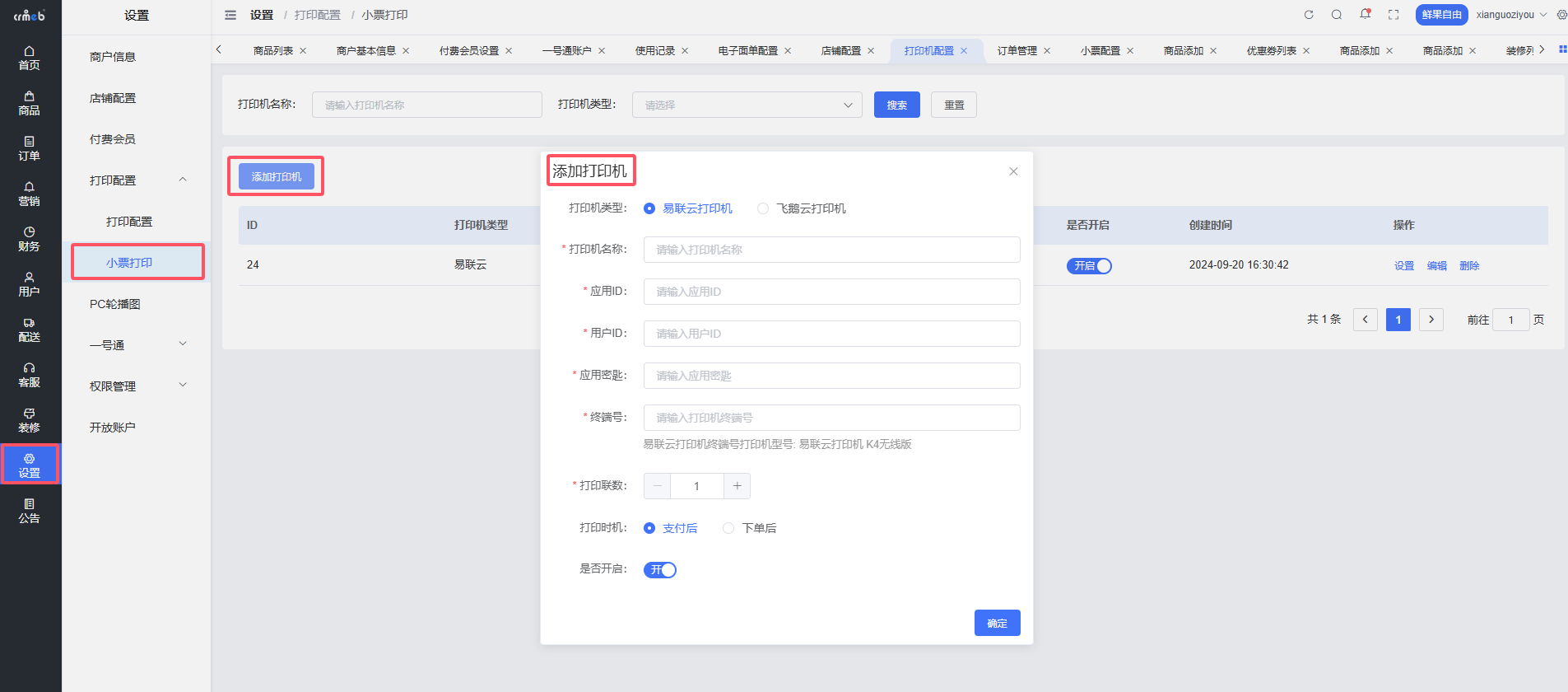 添加小票打印机,可同时设置打印联数;支付后打印还是下单后打印。