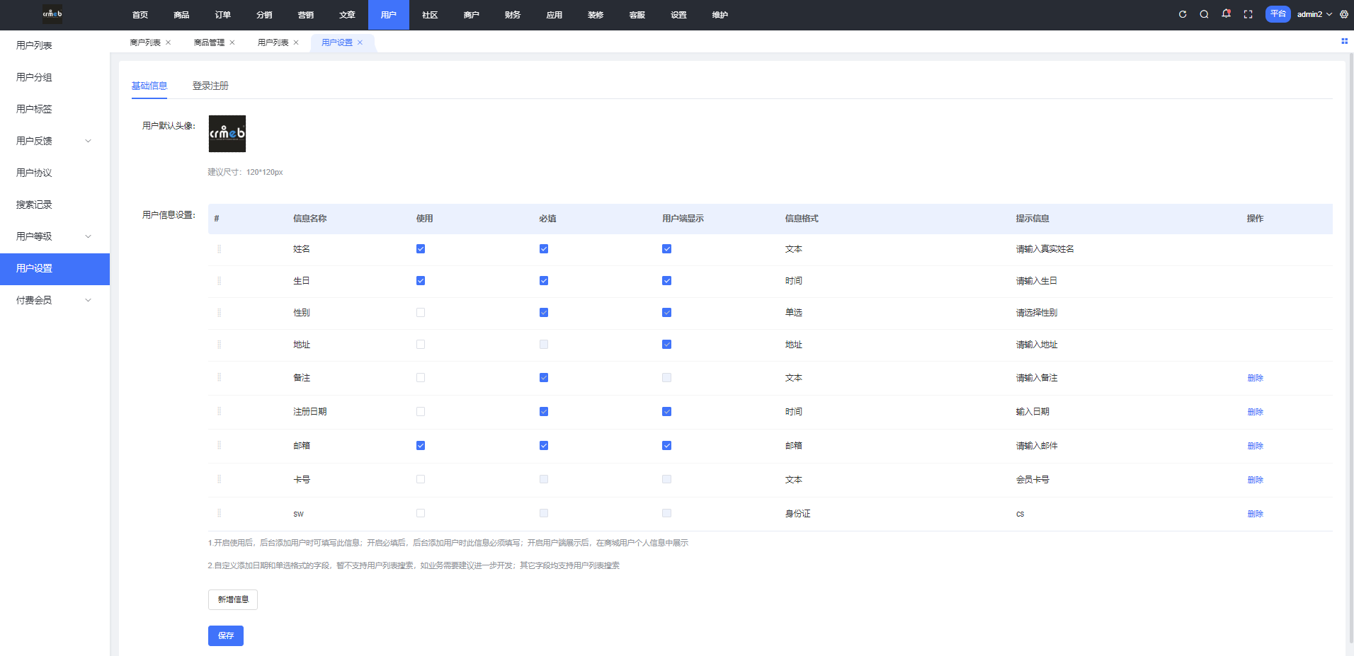 (1)开启使用后,后台添加用户时可填写此信息;开启必填后,后台添加用户时此信息必须填写;开启用户端展示后,在商城用户个人信息中展示,用户可根据商城要求补全信息。