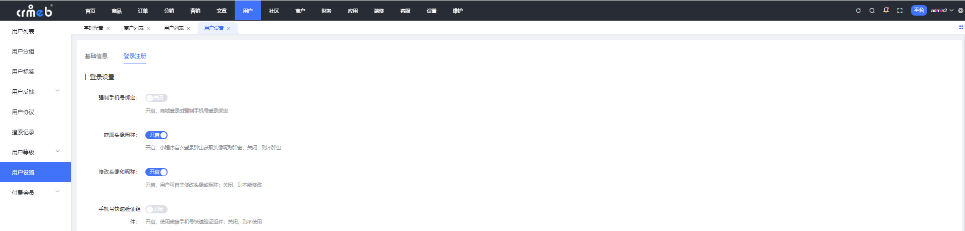 用户设置:主要用于平台统一设置用户默认头像、用户自定义信息、用户登录方式及新用户注册有礼,方便平台对用户信息统一设置及管理。