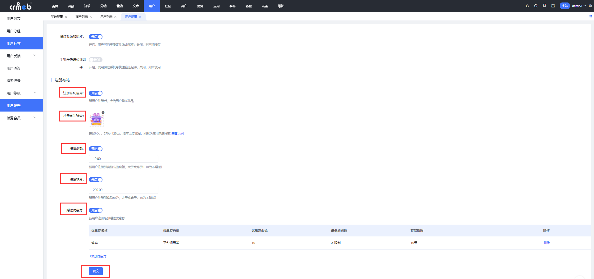 (1) 注册有礼开启:此功能启用,新用户注册后,会给用户赠送此处设置的礼品;关闭则不启用。