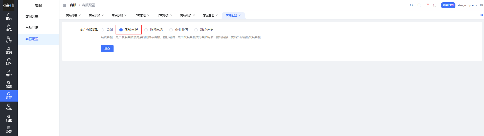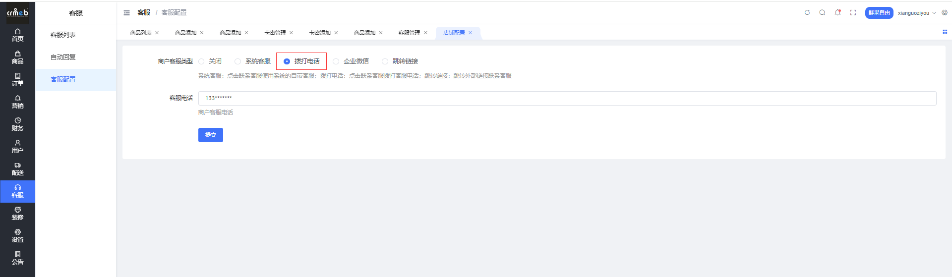 客服设置,主要用于各店铺根据业务需要设置不同客服方式,方便灵活管理。