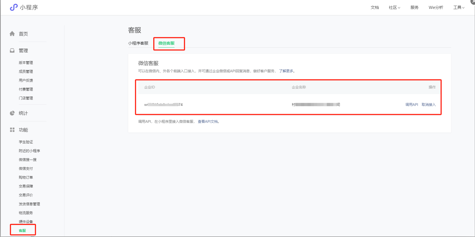 第四步:然后再将企业ID在小程序平台客服里面绑定