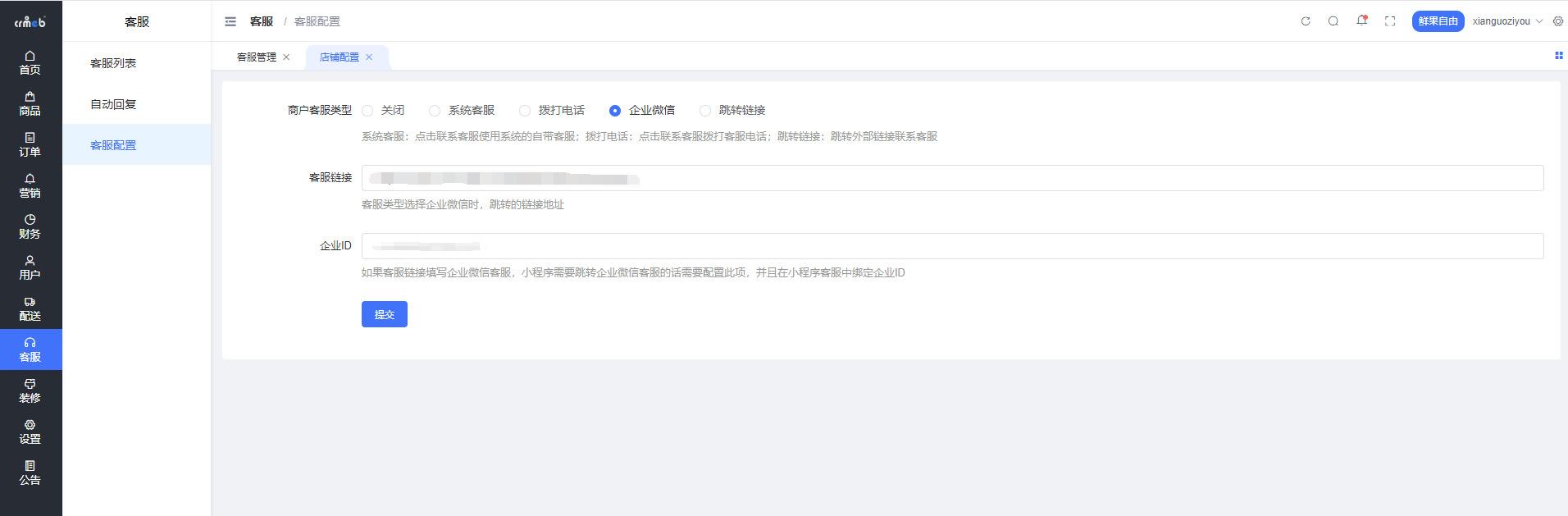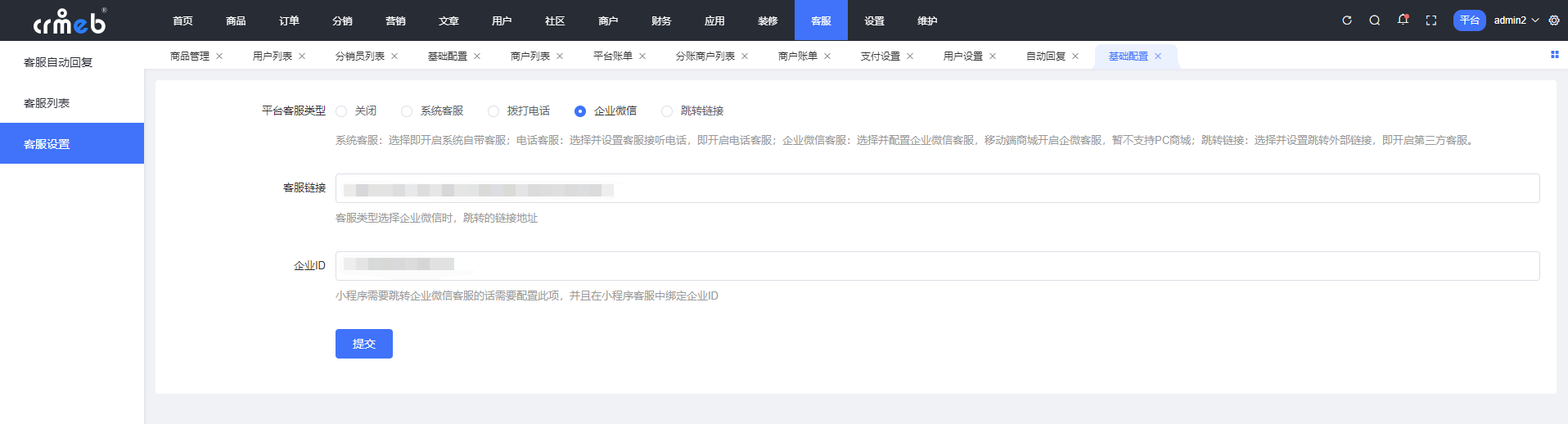 第四步:将找到的客服链接和企业ID ,根据业务需要配置在商户后台和平台后台