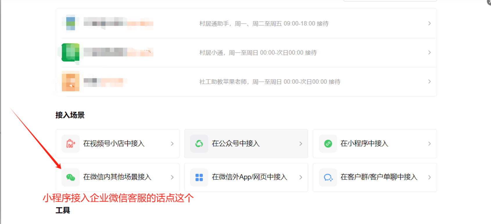 创建好客服账号然后翻到下面设置接入场景,有微信内和微信外,根据自己的须知设置,本教程以微信内小程序为例
