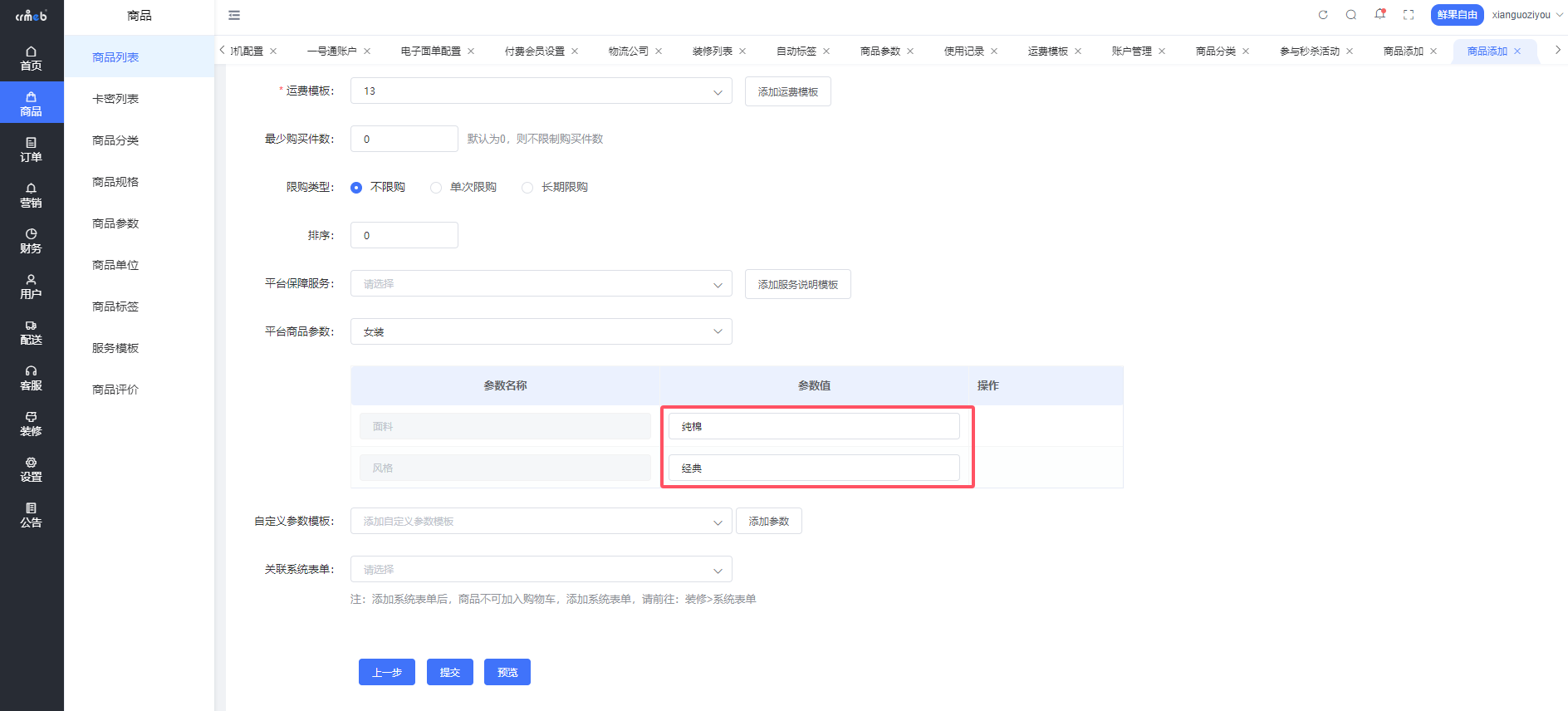 其次: 商户后台添加或编辑A 商品时,设置选择第一步添加的平台商品参数;