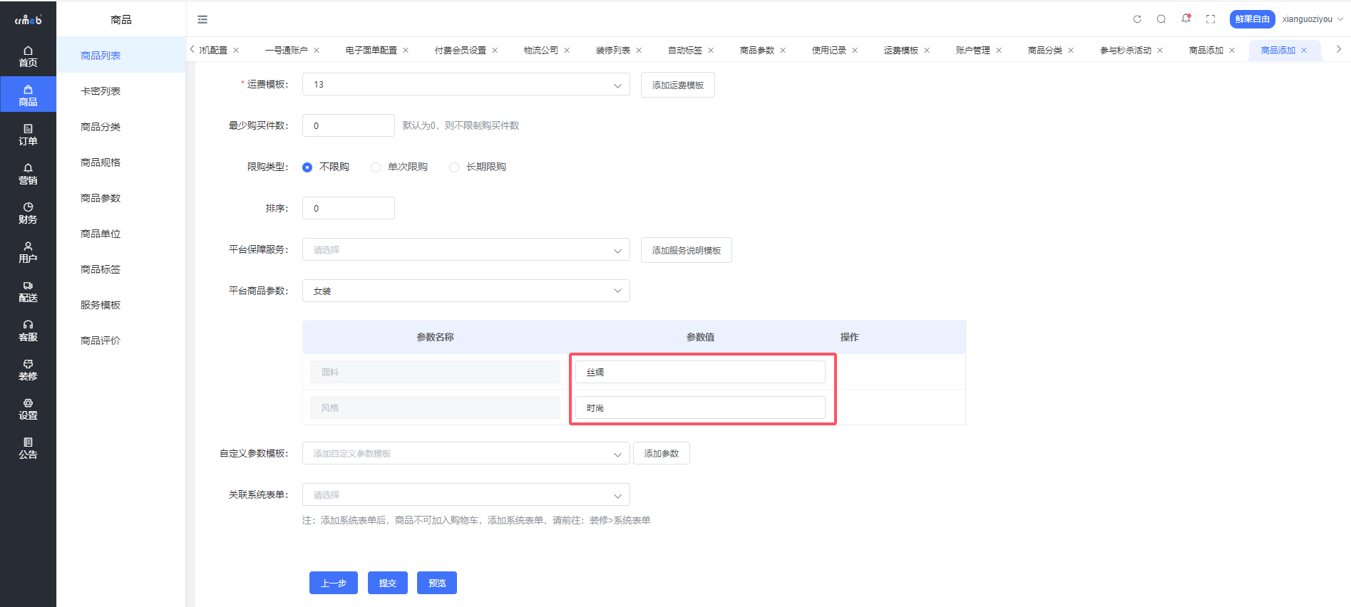 首先: 平台后台添加平台商品参数,一个参数名下只设置一个参数值;