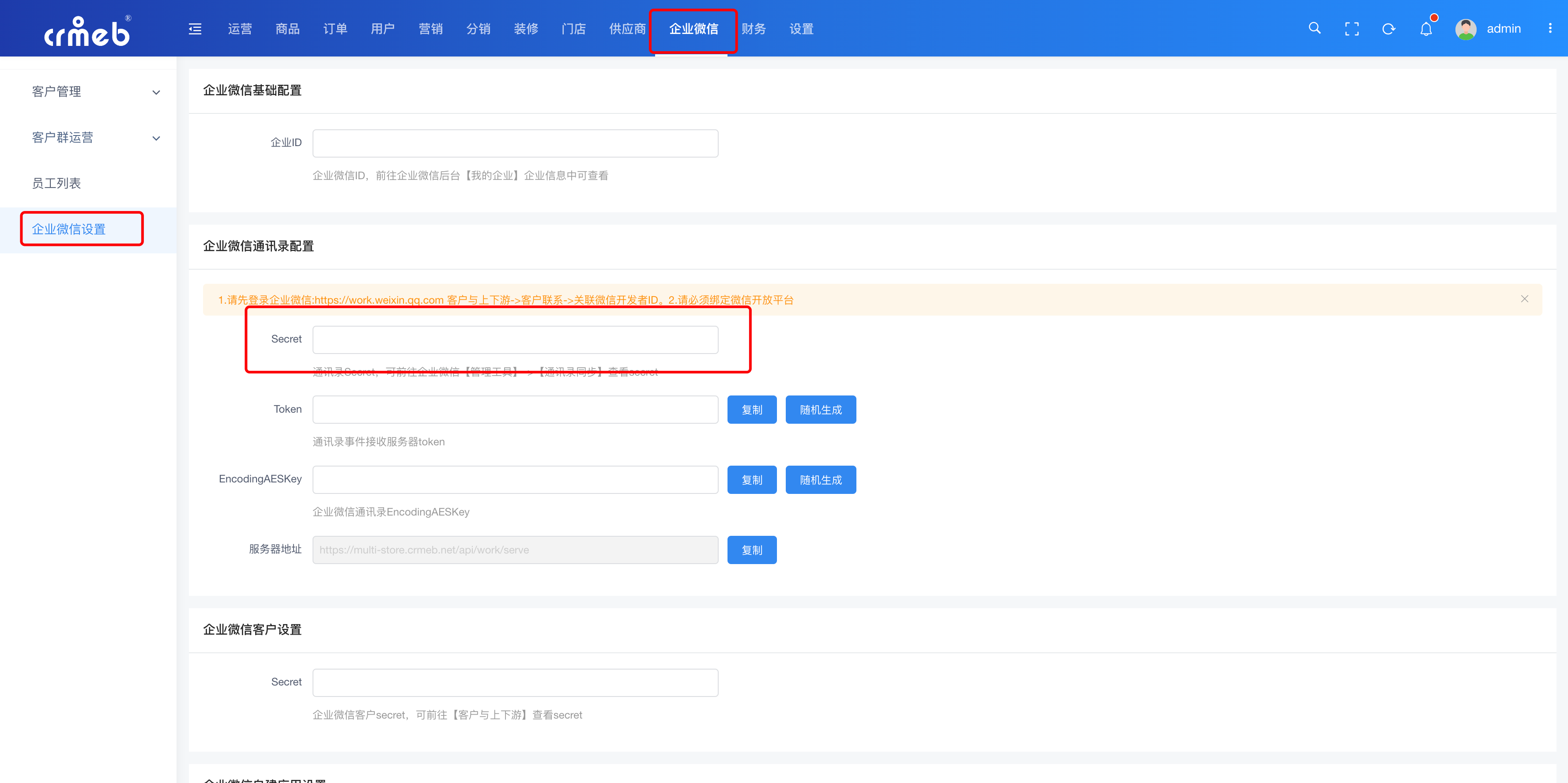 进入编辑页面如下如图,需要复制平台端的【企业微信通讯录配置】》Token 和 EncodingAESKey 和 服务器地址,到 下图中对应的位置中,点击保存。直到提示配置成功