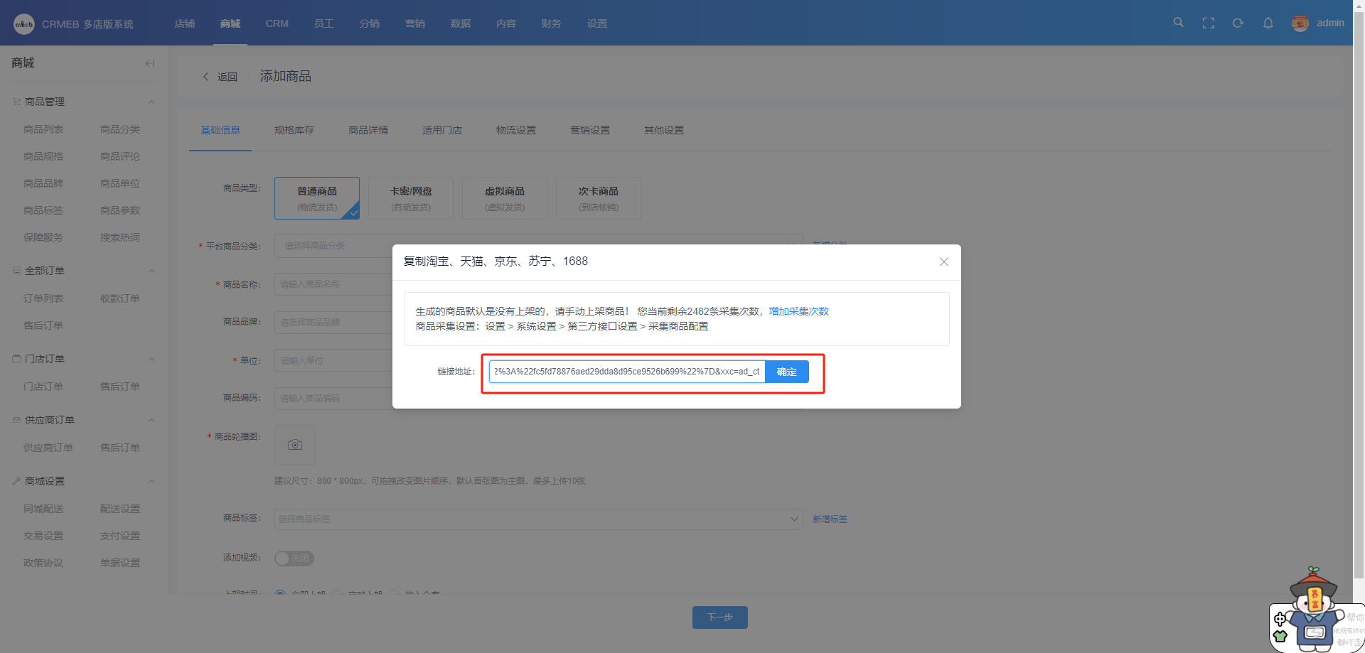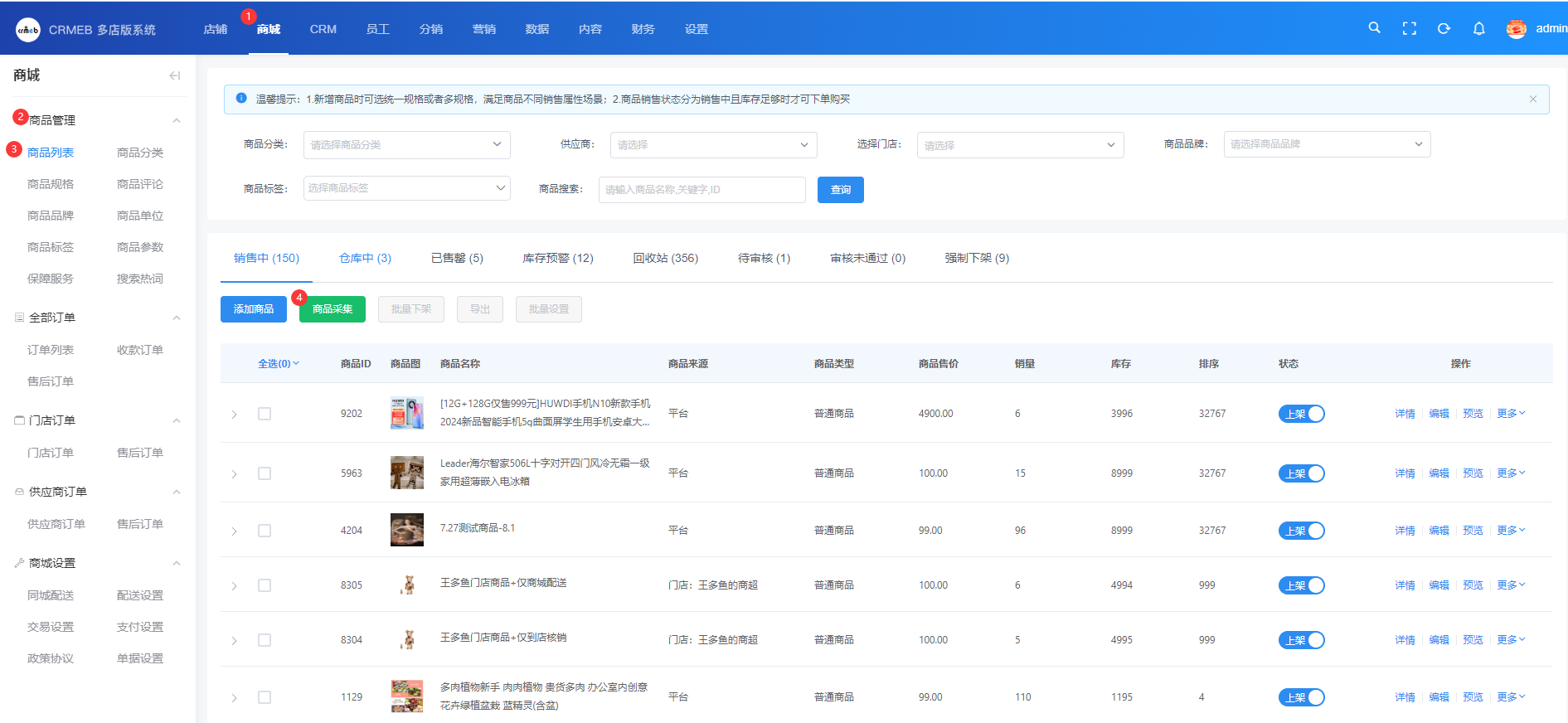 2、 打开CRMEB系统后台,商品管理 - 商品列表 -商品采集