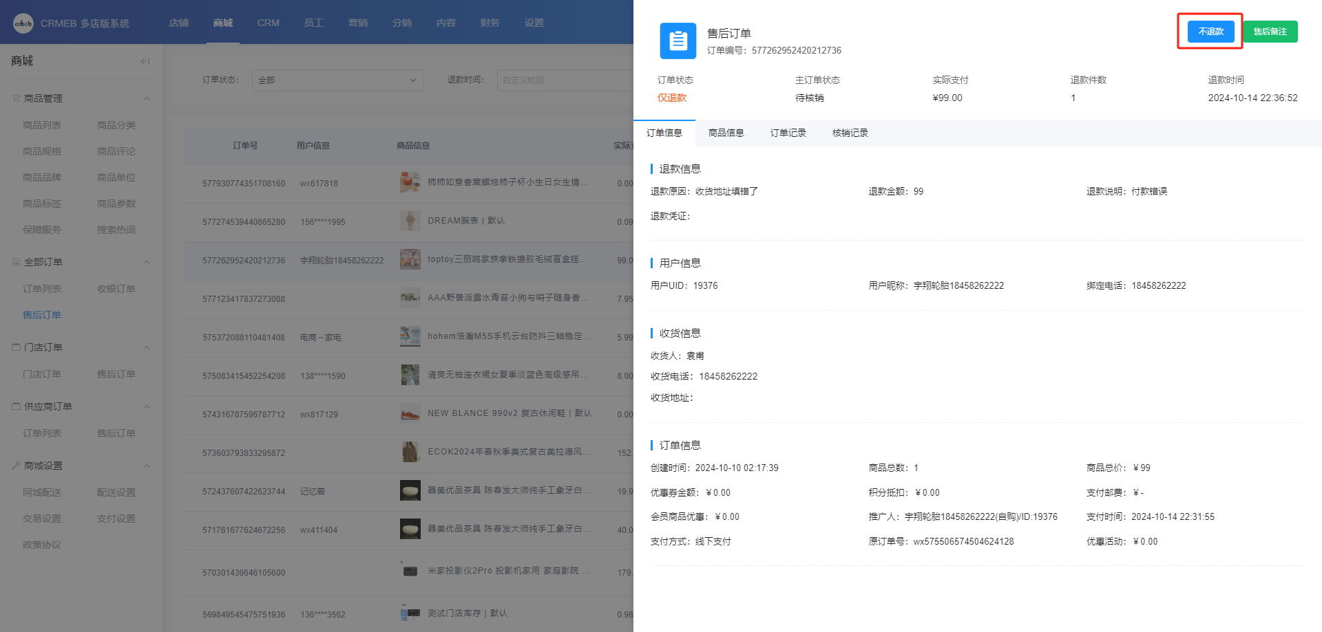 用户申请仅退款售后,商家可操作立即退款,或于订单详情中拒绝退款。