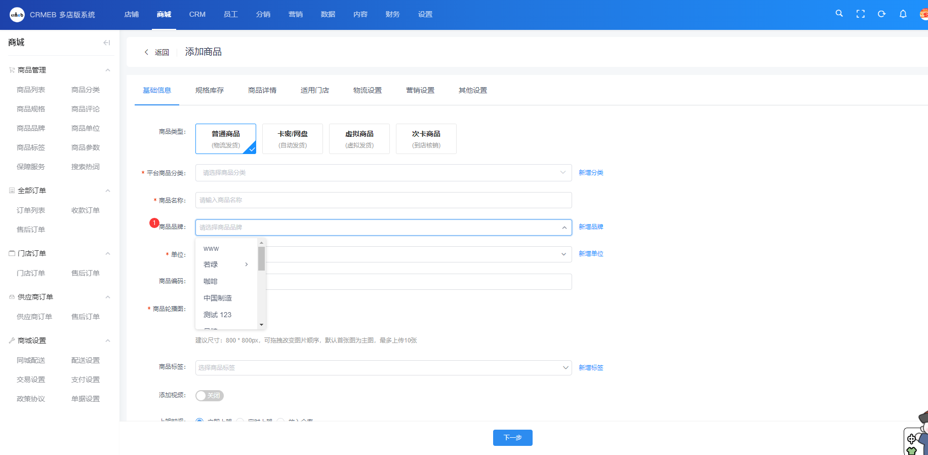 添加商品时选择品牌信息。(可快捷添加品牌)