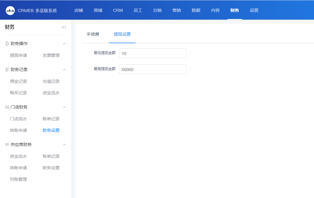 可设置门店单次可提现的最低和最高金额