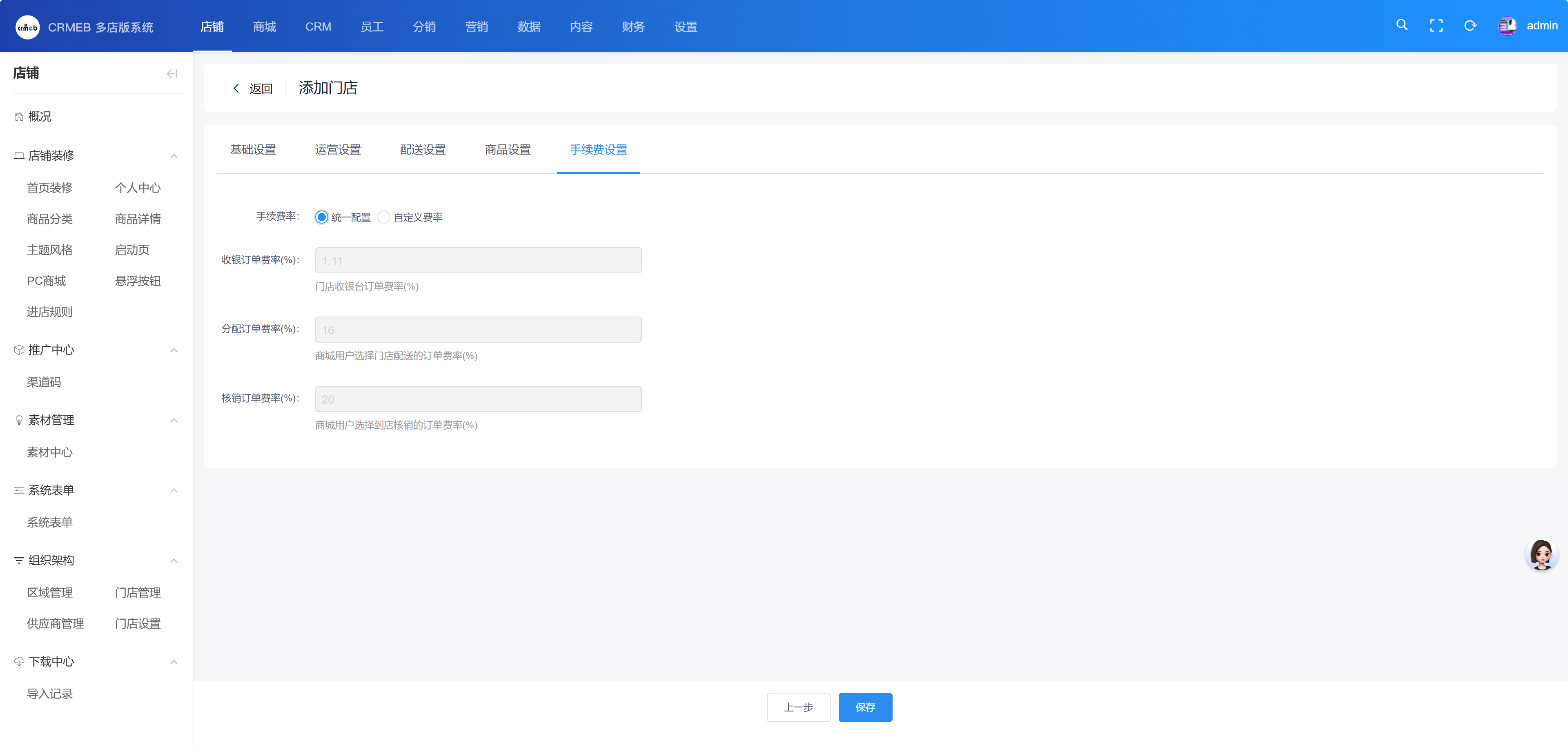 自定义:商城可以自定义某一门店的手续费率。