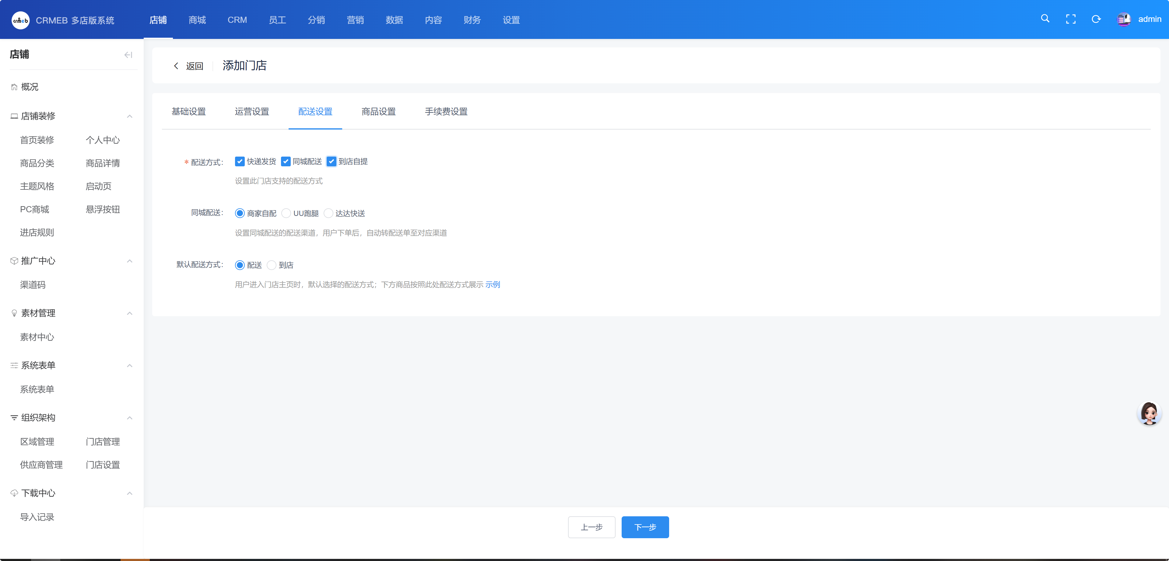同城配送:由门店或第三方配送系统提供上门配送服务,门店可于后台系统配置服务半径、配送费等相关参数。