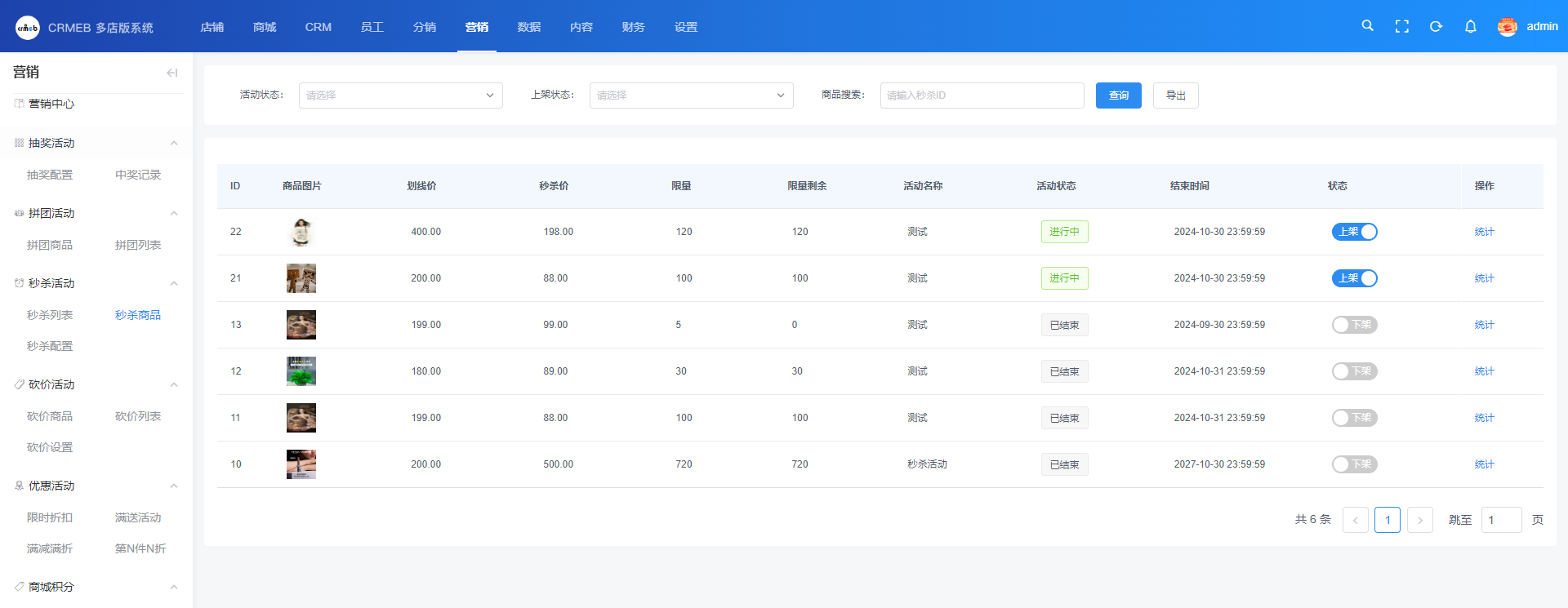 秒杀活动中添加的商品会在此处显示,可操作上下架。
