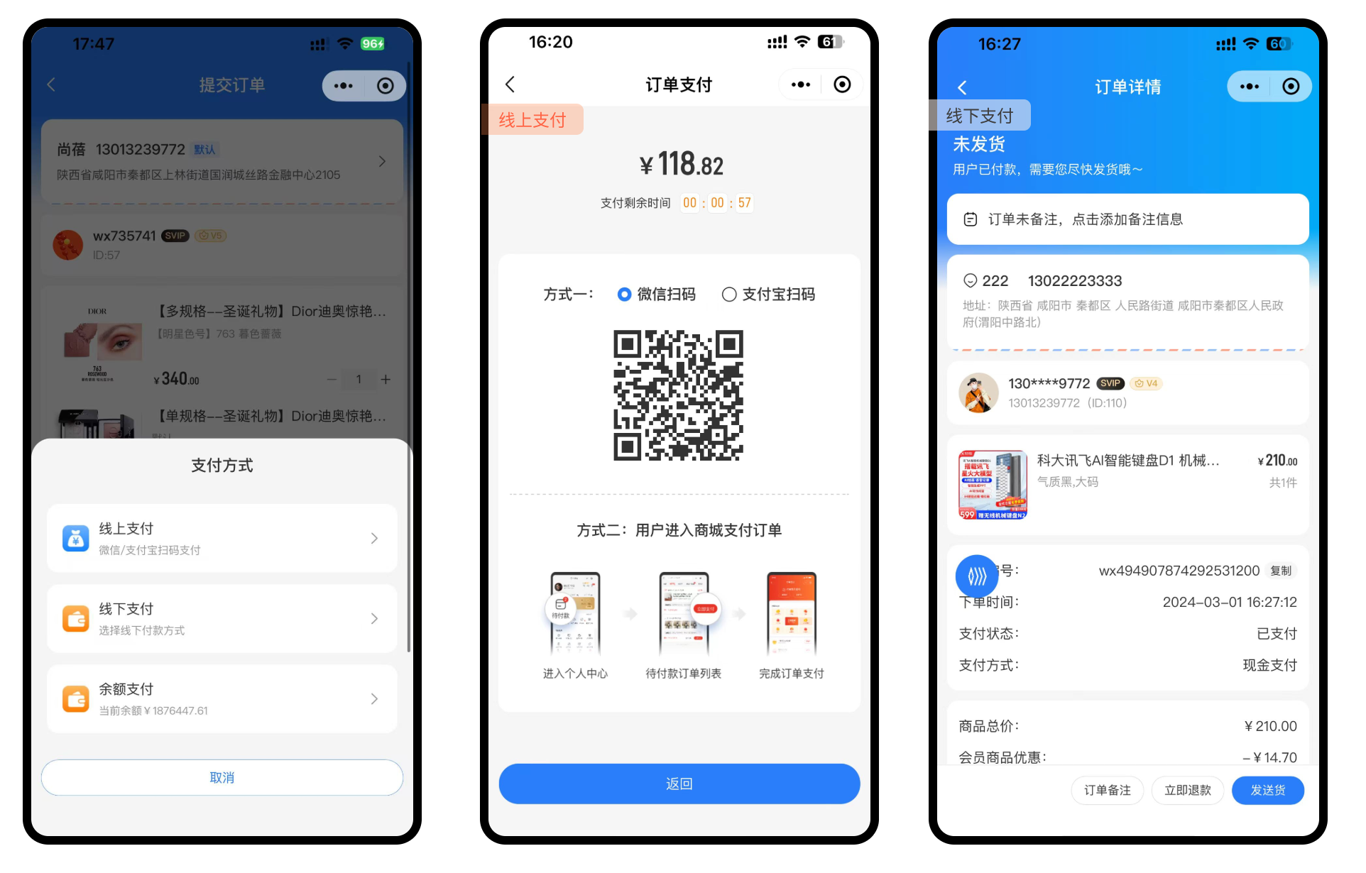 选择线上付款时,可扫码支付或用户于用户端待付款订单中支付。