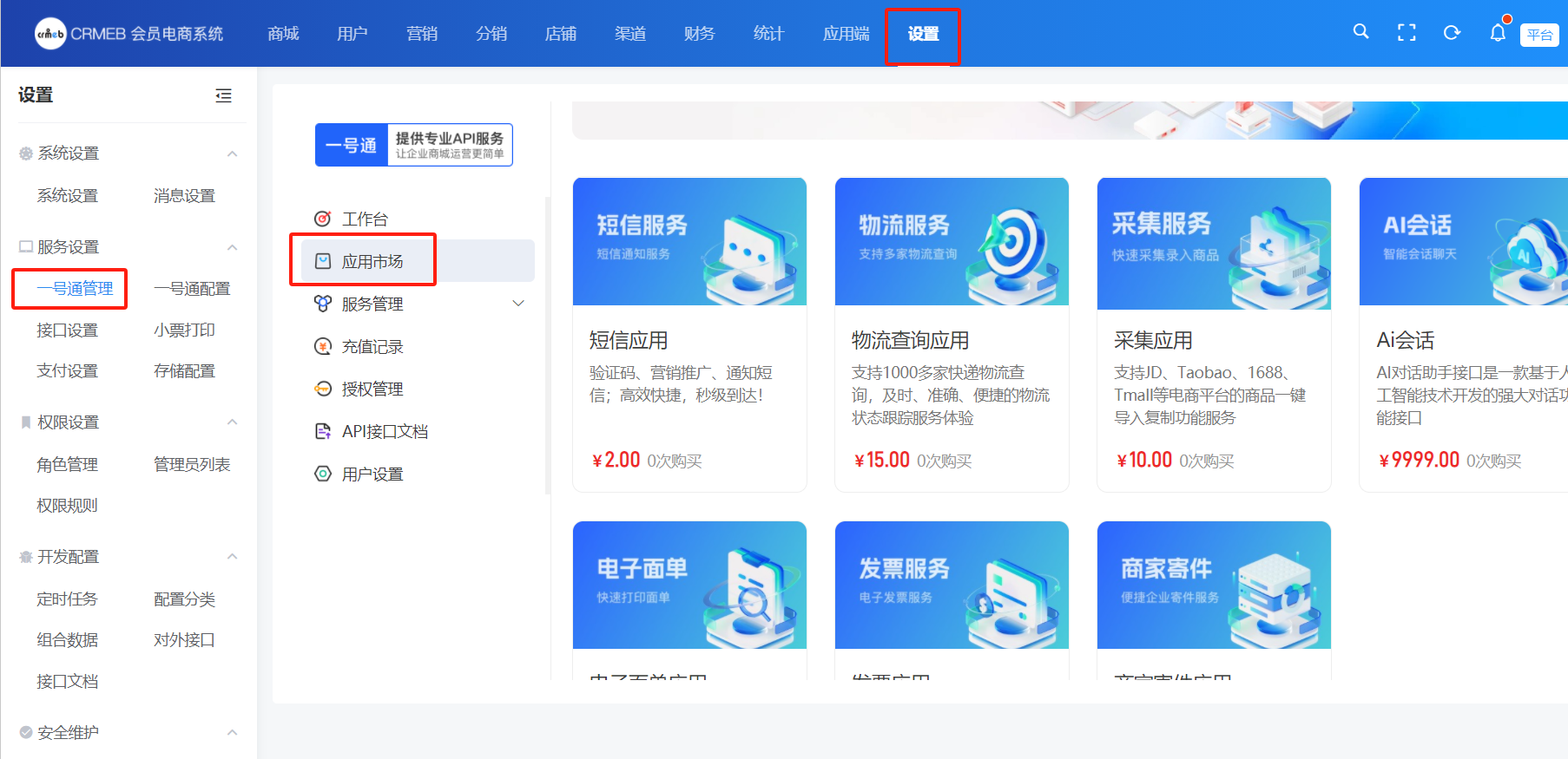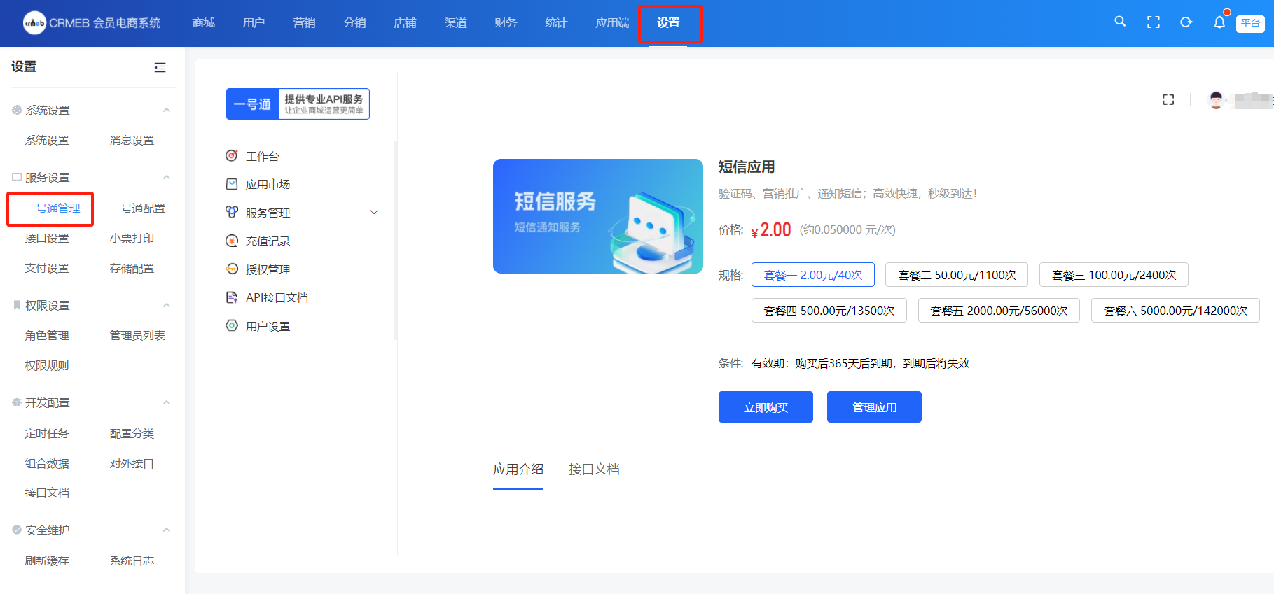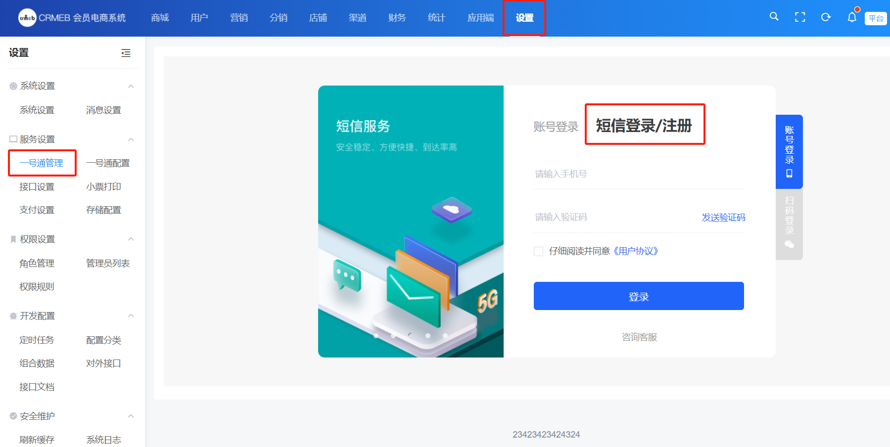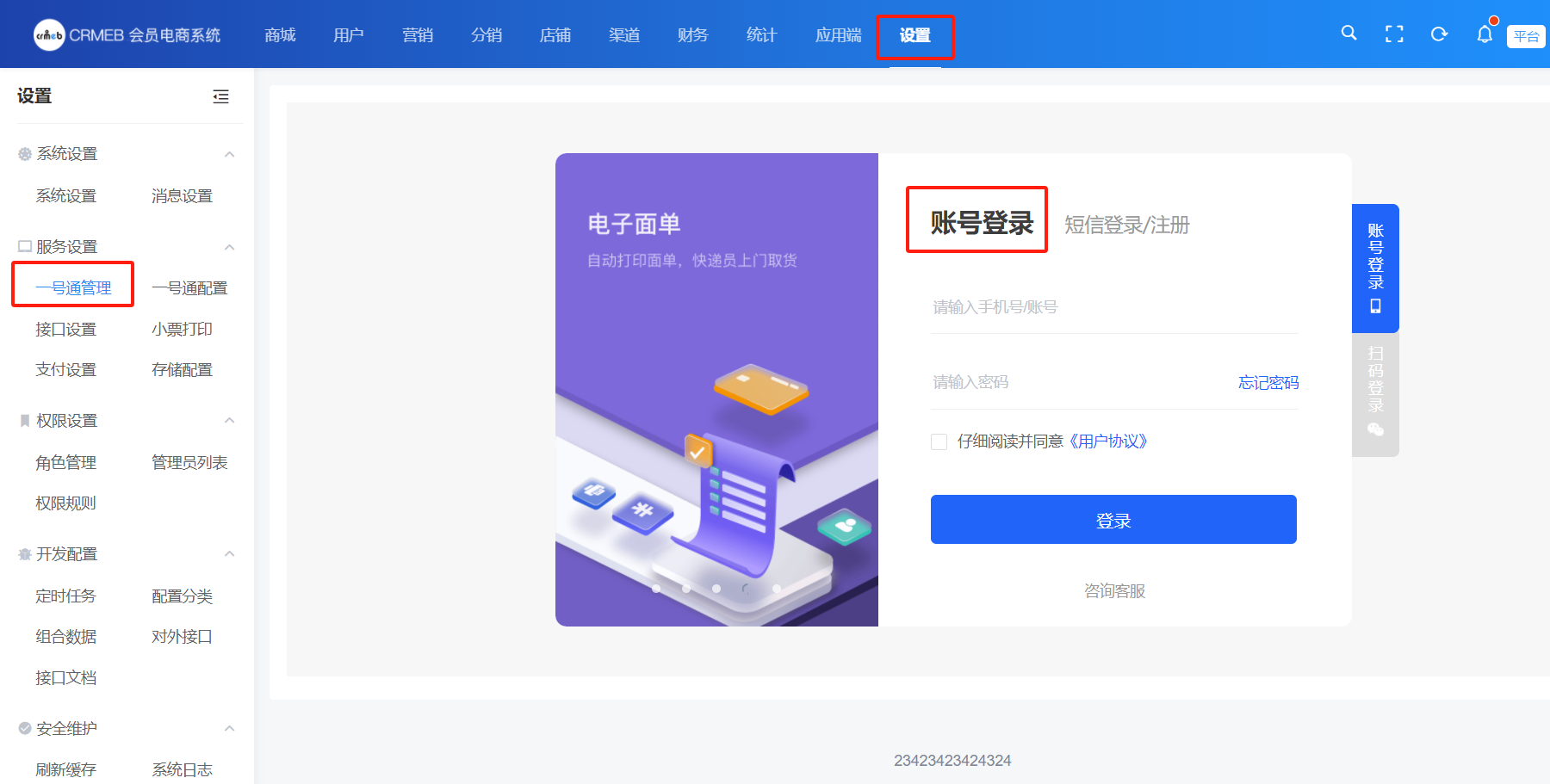 系统安装完成后,登录管理后台,设置管理 - 一号通管理