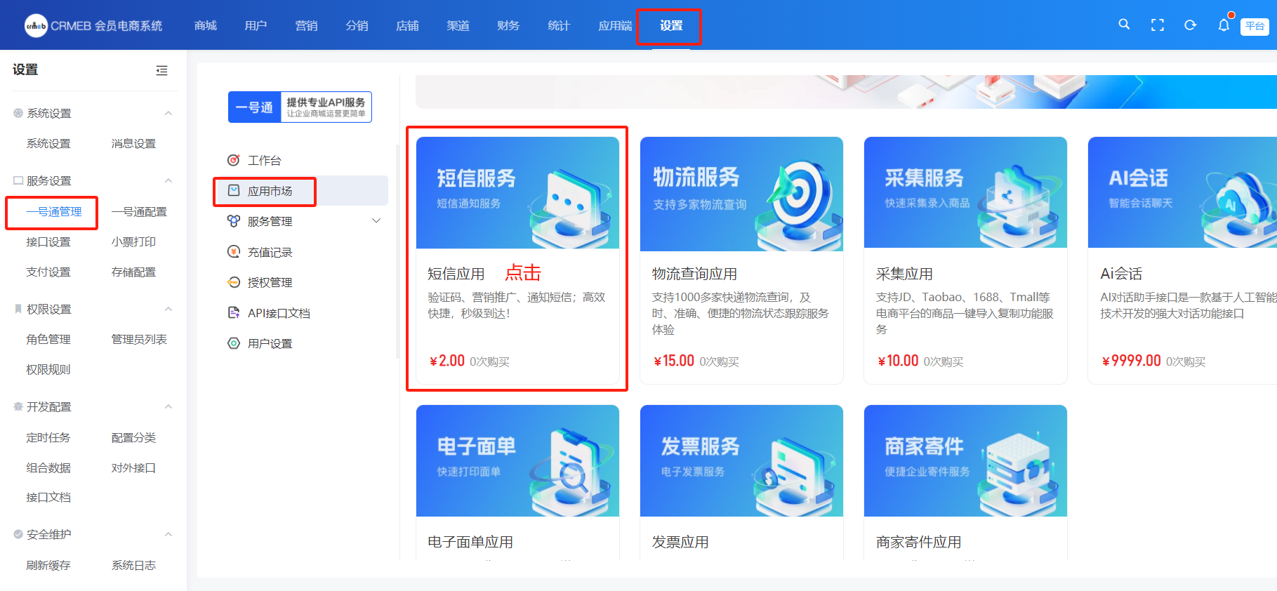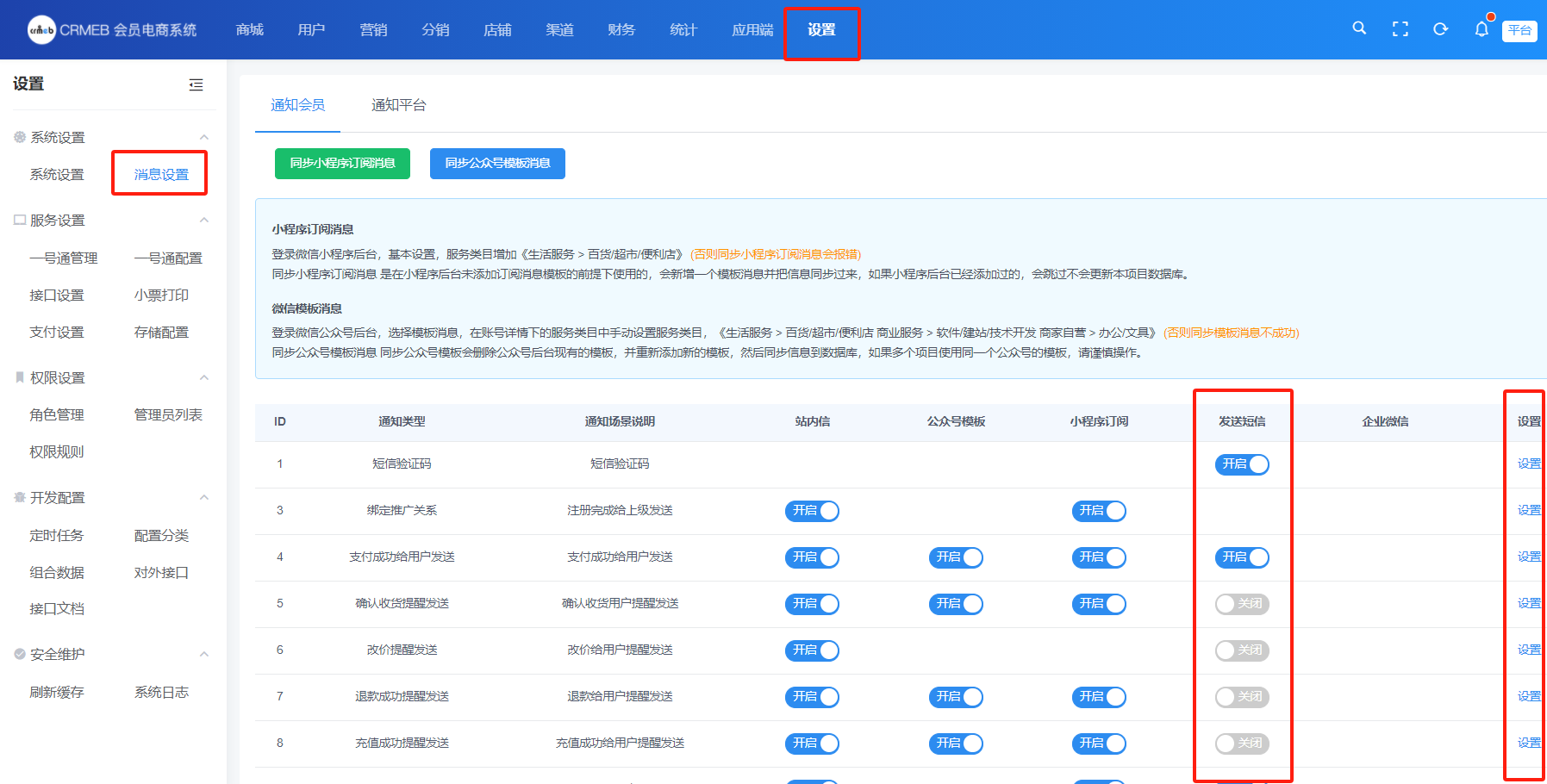 打开CRMEB后台,设置-消息设置,即可设置修改关闭某项服务。