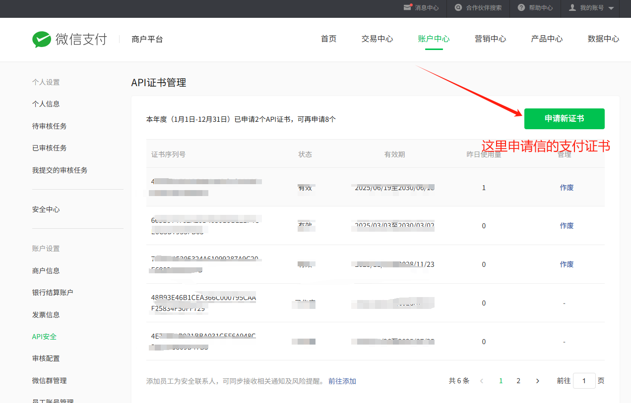 3.点击下载证书工具按钮;下载并打开文件WXCertUtil.exe后;在【证书工具】,点击申请证书 按钮,如下图: