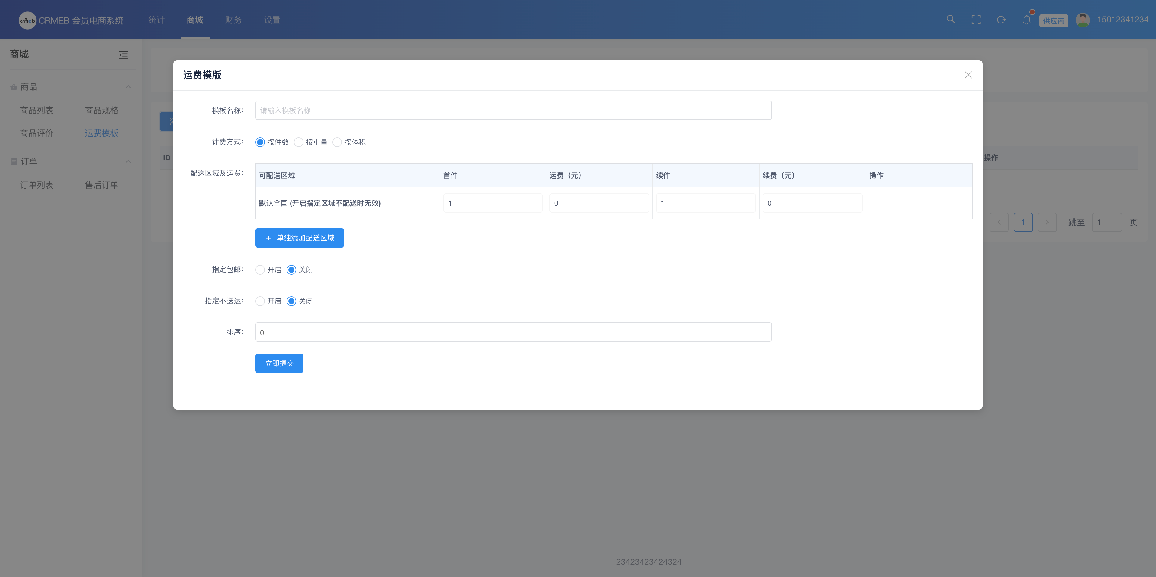供应商可定义自己的运费模板,于商品添加时选择。添加说明见商城设置 > 商城邮费 > 运费模板