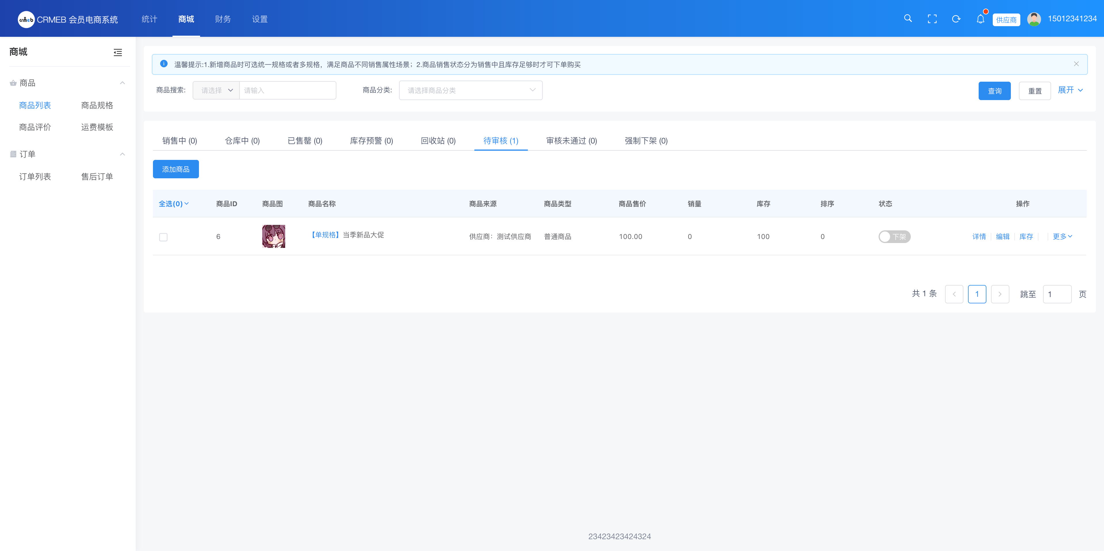 供应商于供应商端添加商品,添加后的商品需由平台审核,审核通过后可上架售卖。用户下单此商品后由供应商直接发货,平台仅负责与其线下结算订单即可,平台可以专注于商城商品的营销与推广工作。