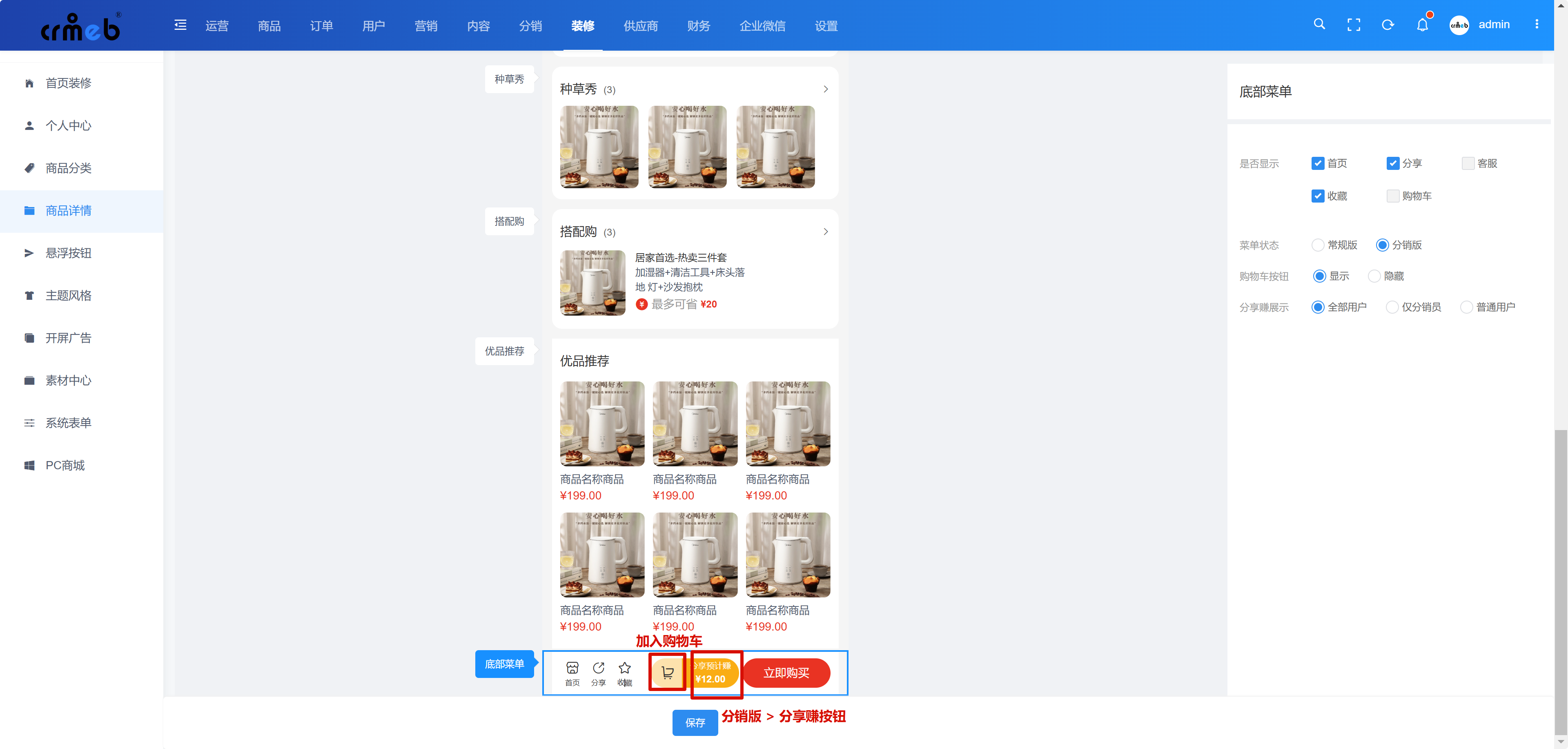 分销版:显示加入购物车,分销预计赚和立即购买按钮。
