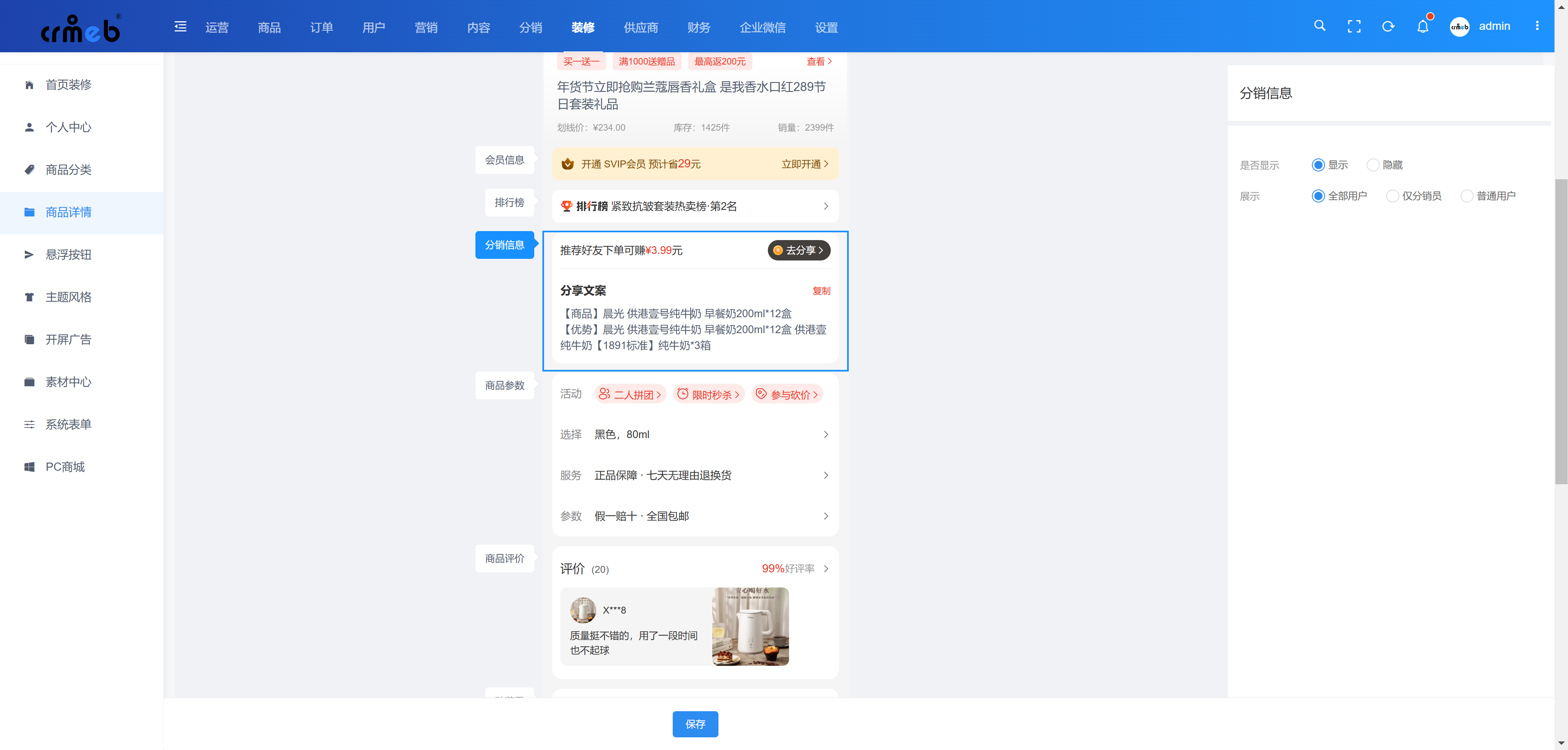 支持控制分销模块的显示与隐藏。