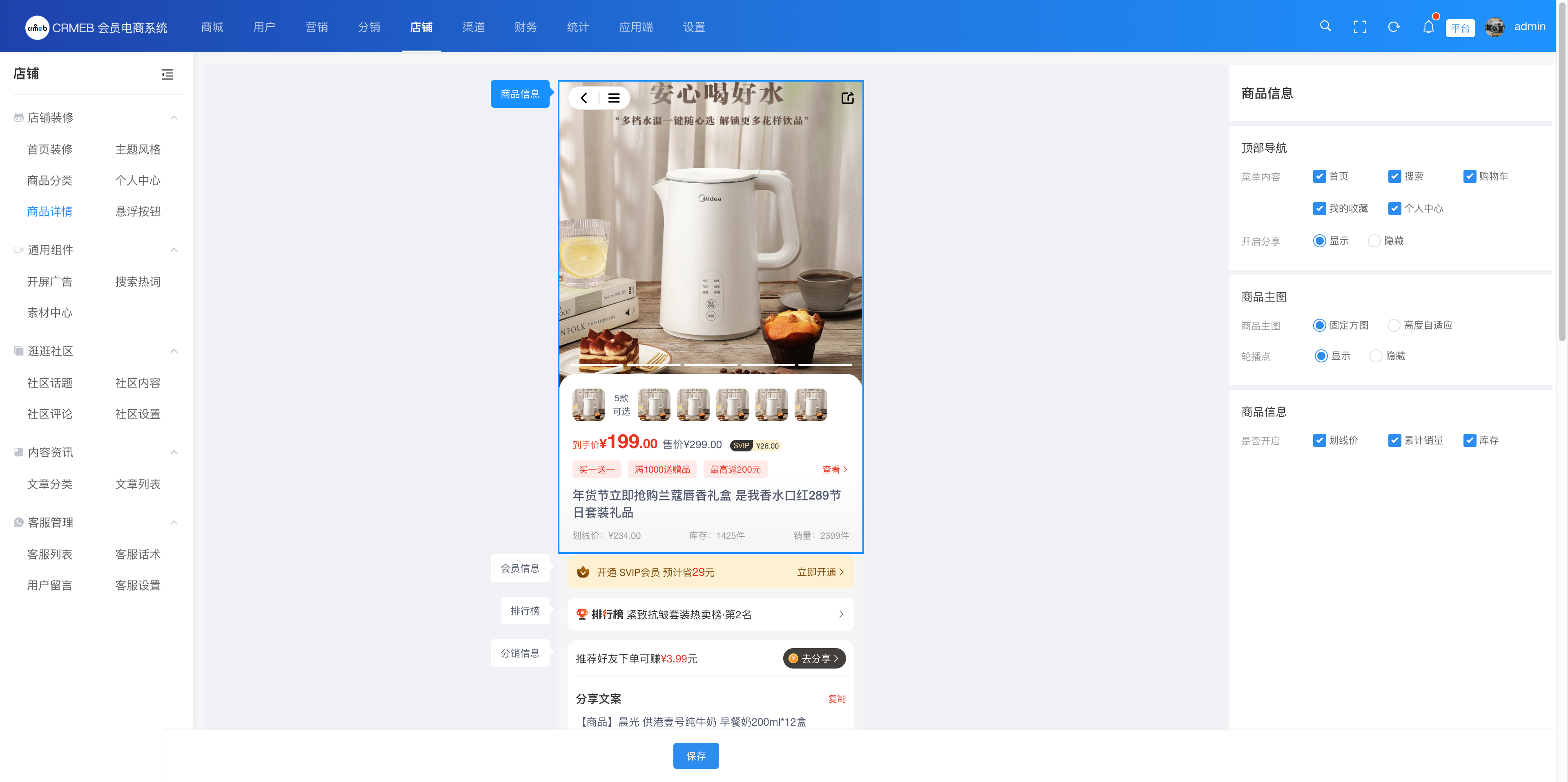 商家可调整商品详情各板块样式,可根据不同的需求开启或关闭单独的板块