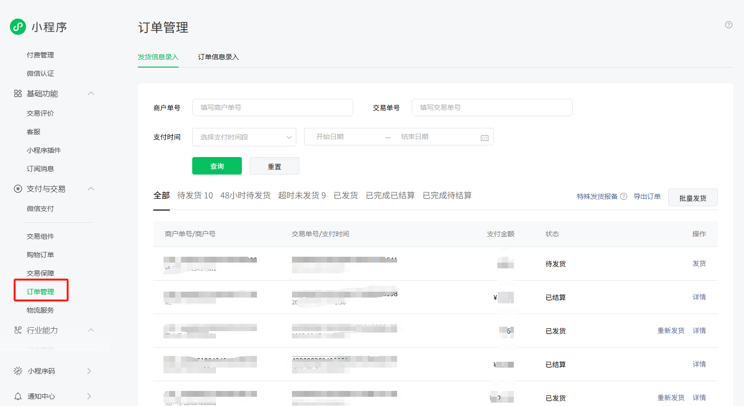 新创建的小程序或者小程序中有对应的类目的情况下,小程序的后台会可能出现订单管理