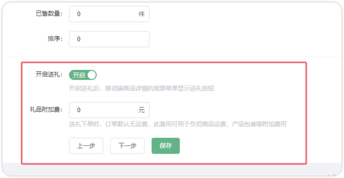 开启送礼功能后,商家可设置该商品的礼品附加费,当用户选择该商品送礼下单时,订单默认无运费,礼品附加费的设置用于负担商品运费、产品包装等附加费用。