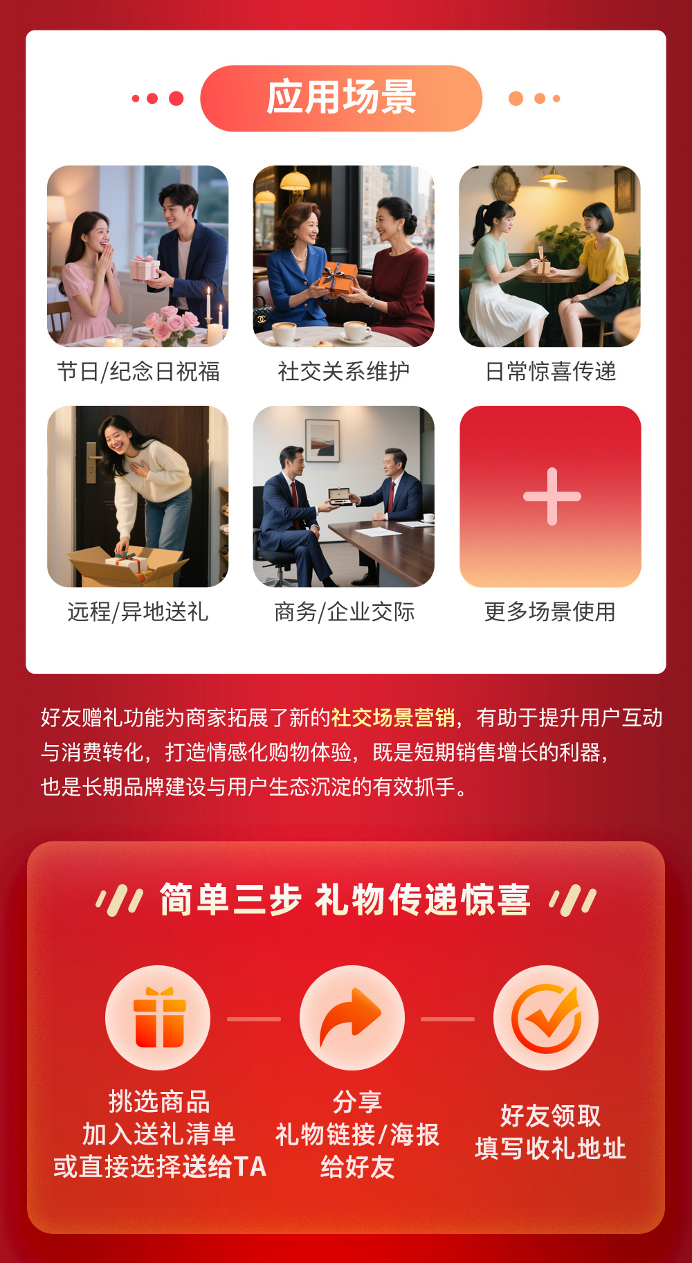 对商家:每一次送礼都是一次精准的社交裂变曝光,带来新用户和潜在转化的机会。