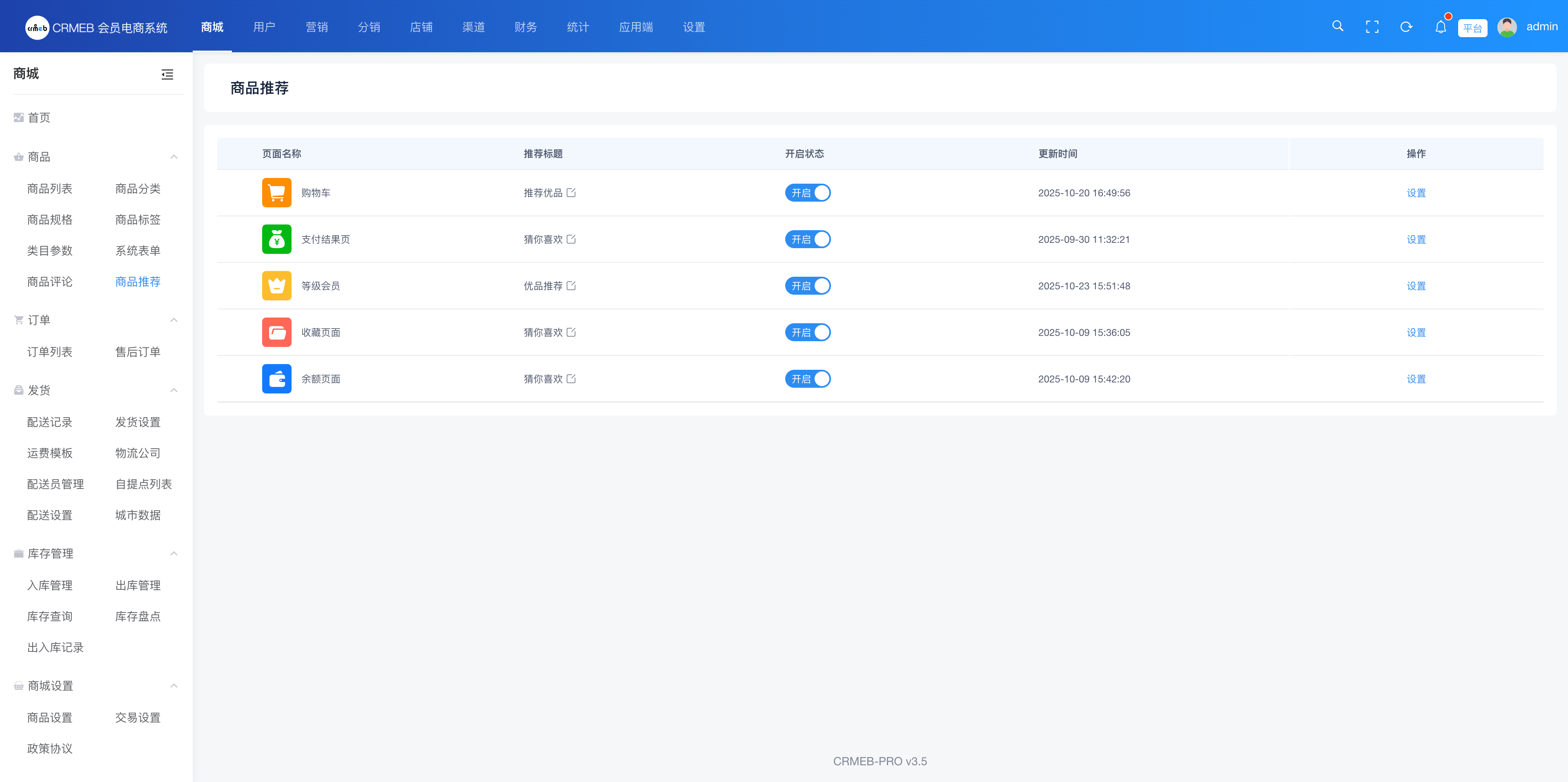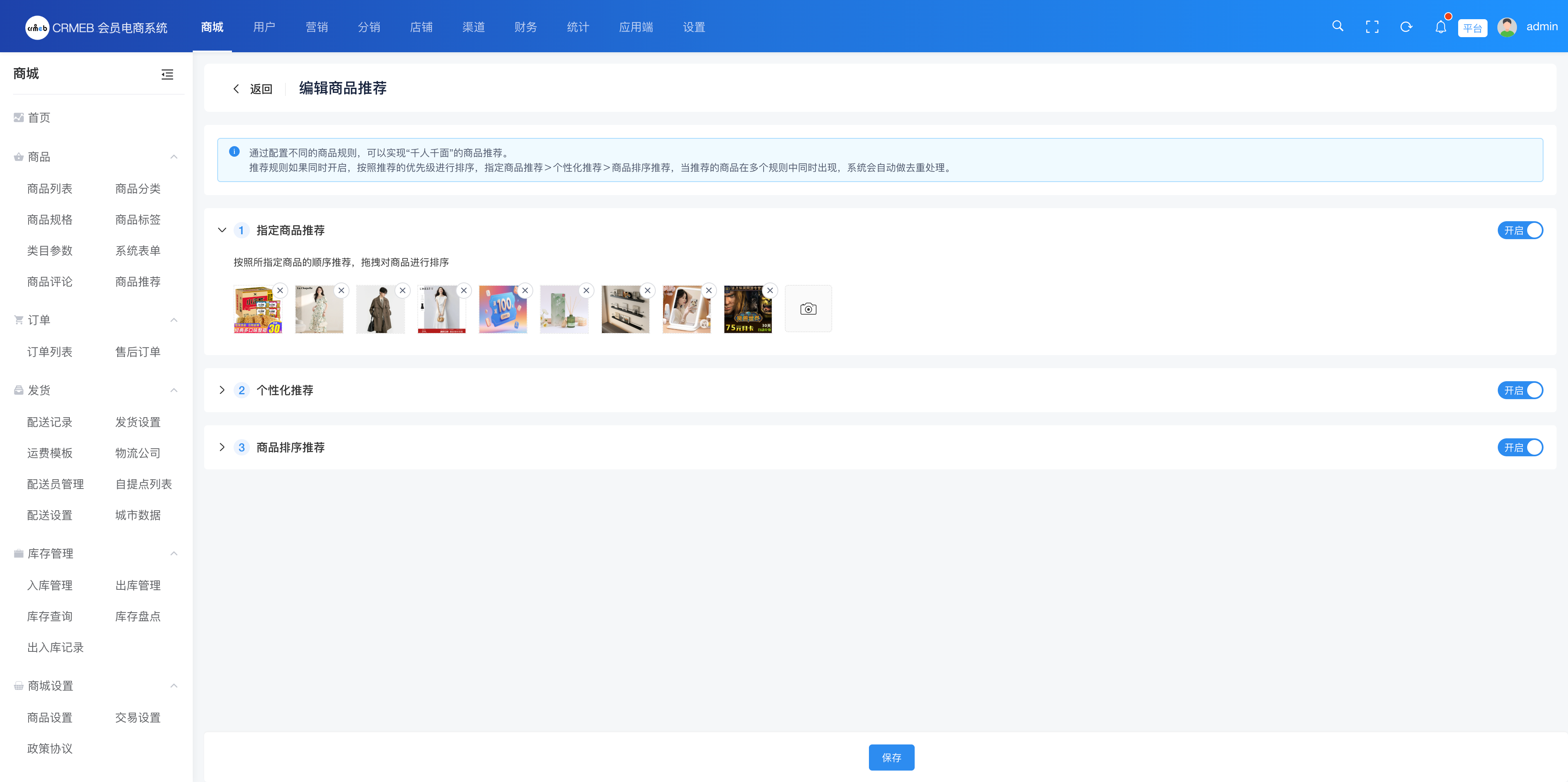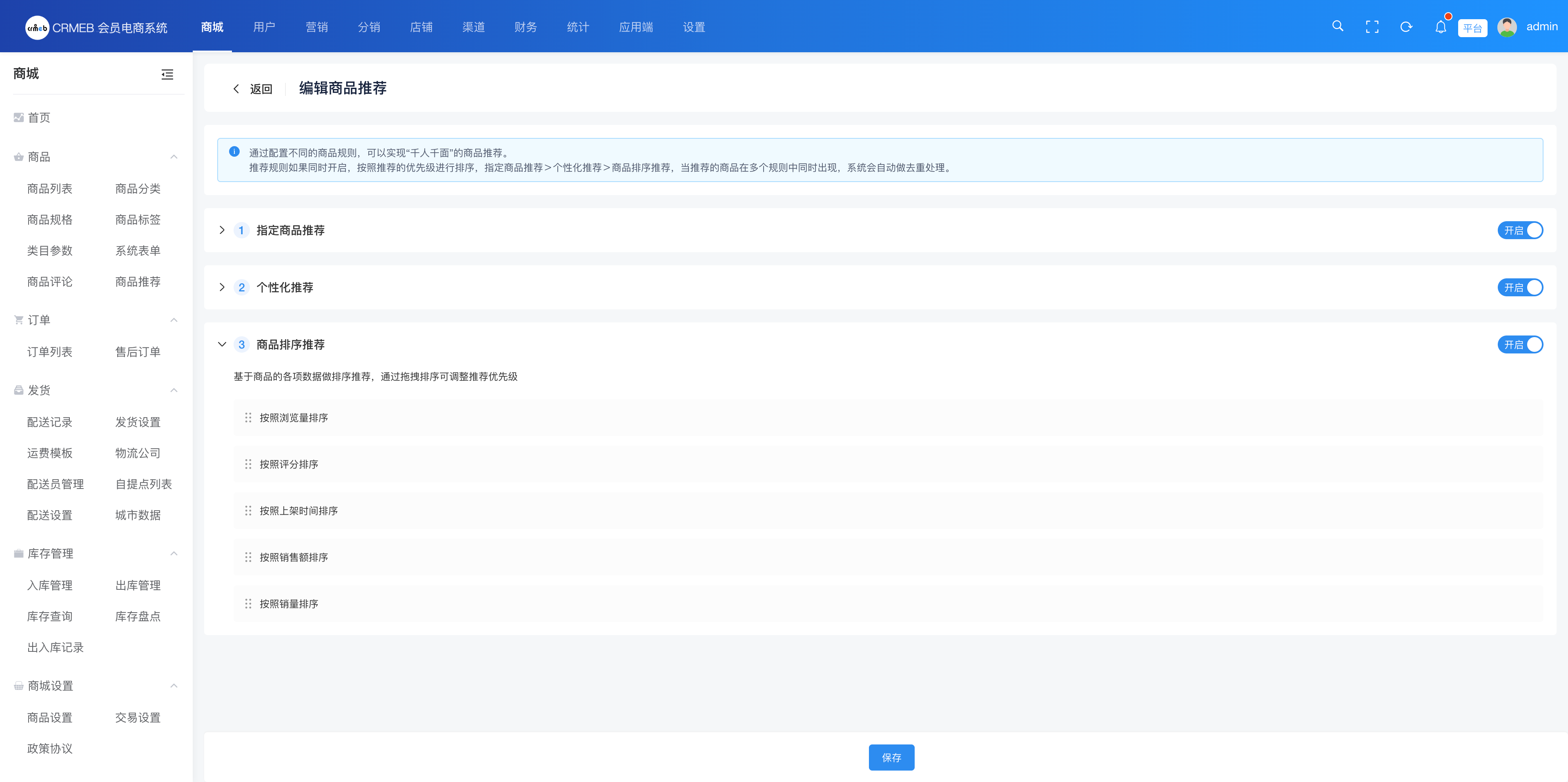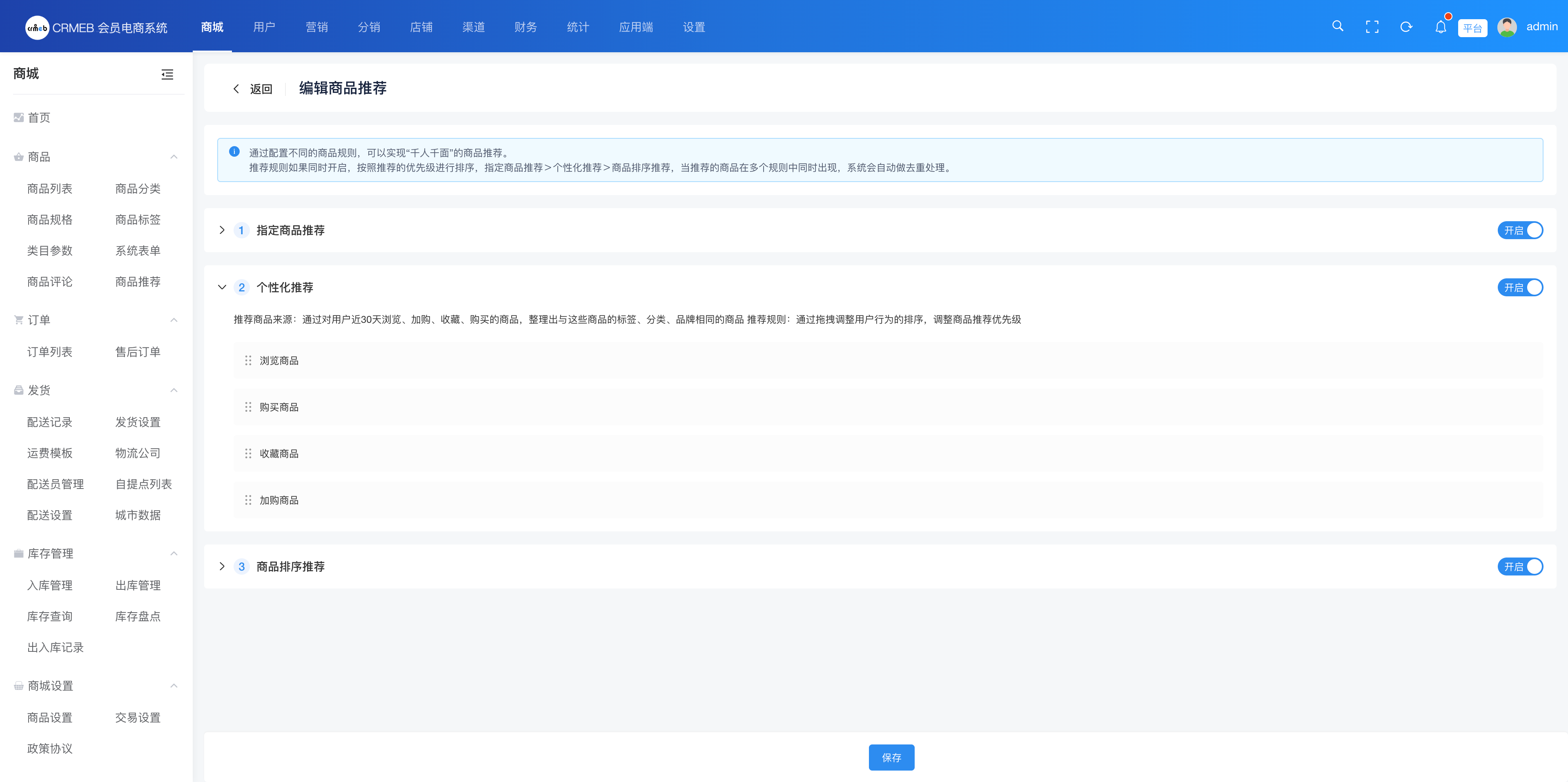 推荐规则:支持个性化推荐、商品排序推荐、指定商品推荐三种方式,可叠加使用。