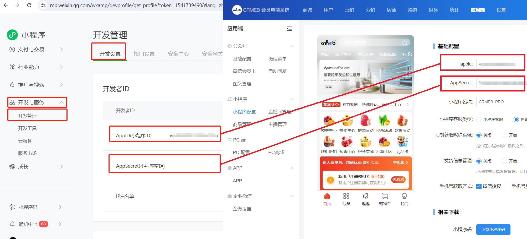 2、将小程序平台的appid和密钥填到管理后台并保存