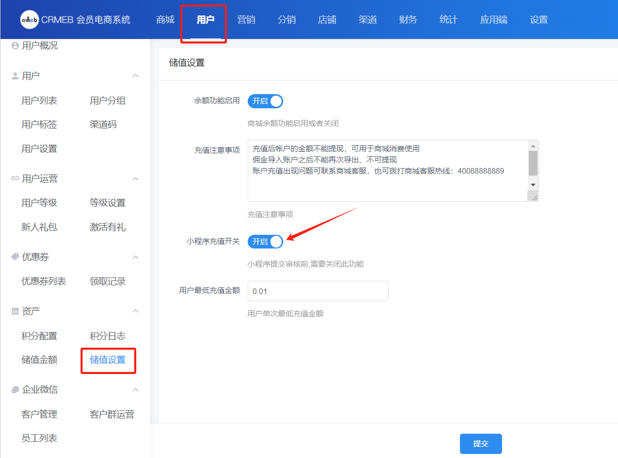 用户→资产→储值设置,小程序充值开关,选择“关闭”,提交。