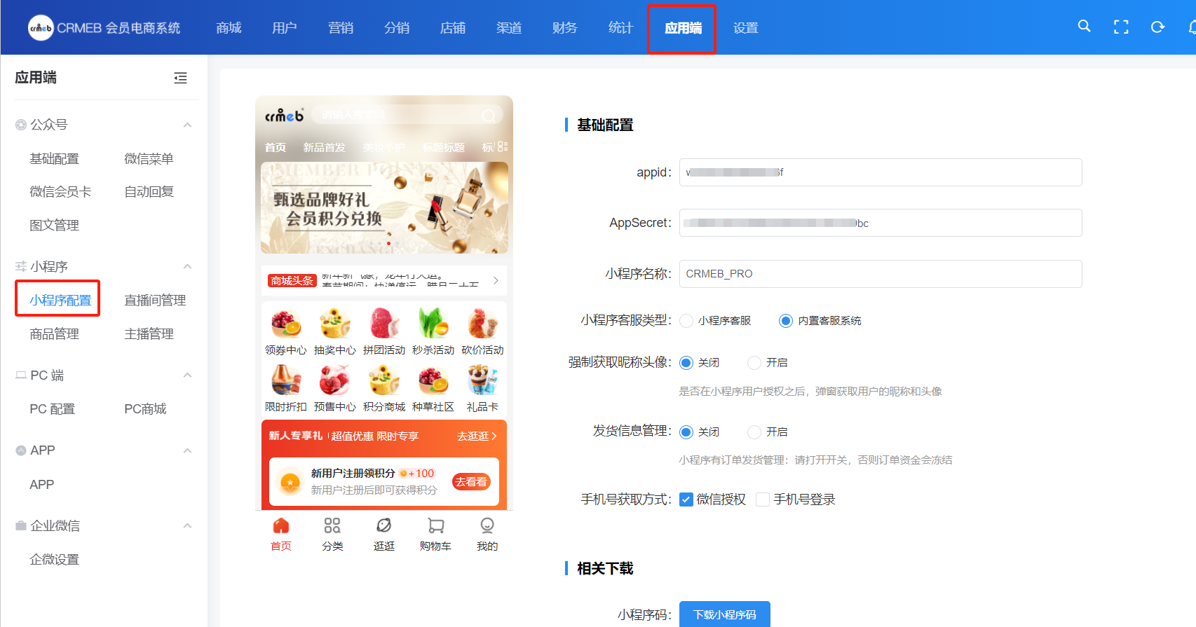 1、进入CRMEB系统后台,点击应用端→小程序配置