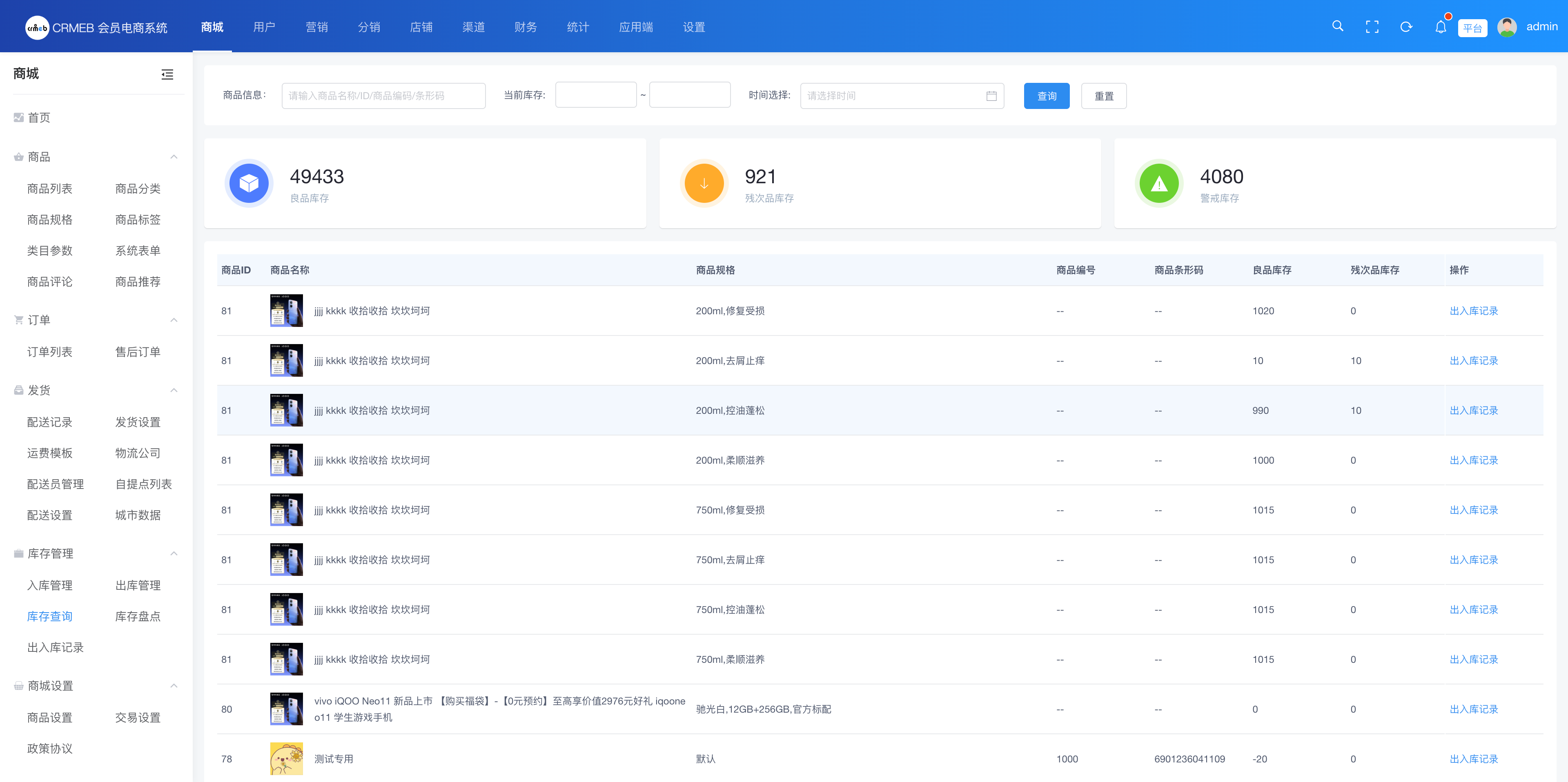 现在商城内所有的商品规格的存库情况