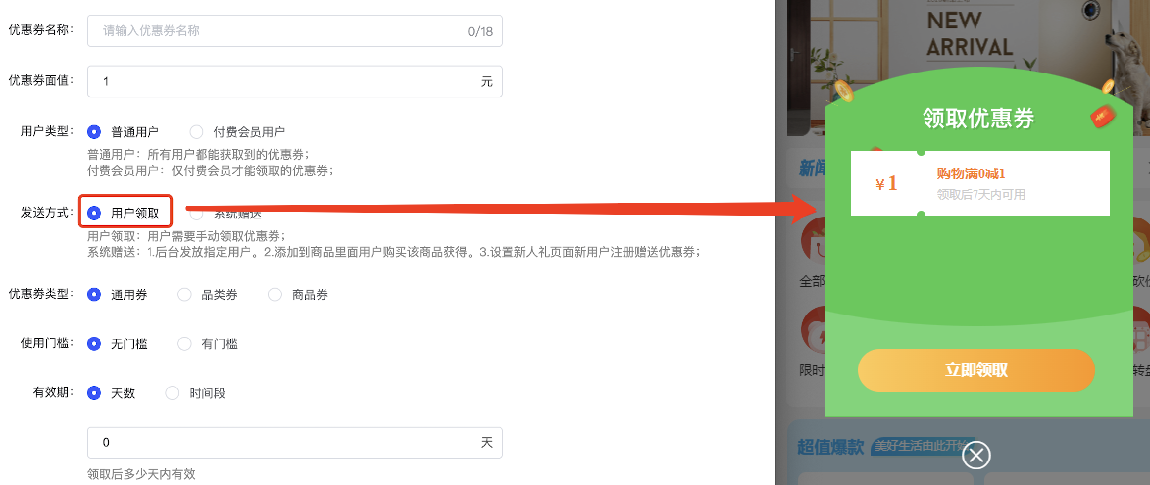 添加该方式的优惠券后,符合条件的用户会在登入系统时收到领取弹窗