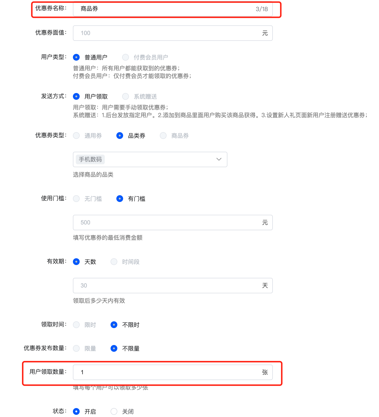 限量:设置优惠券数量,领完为止
