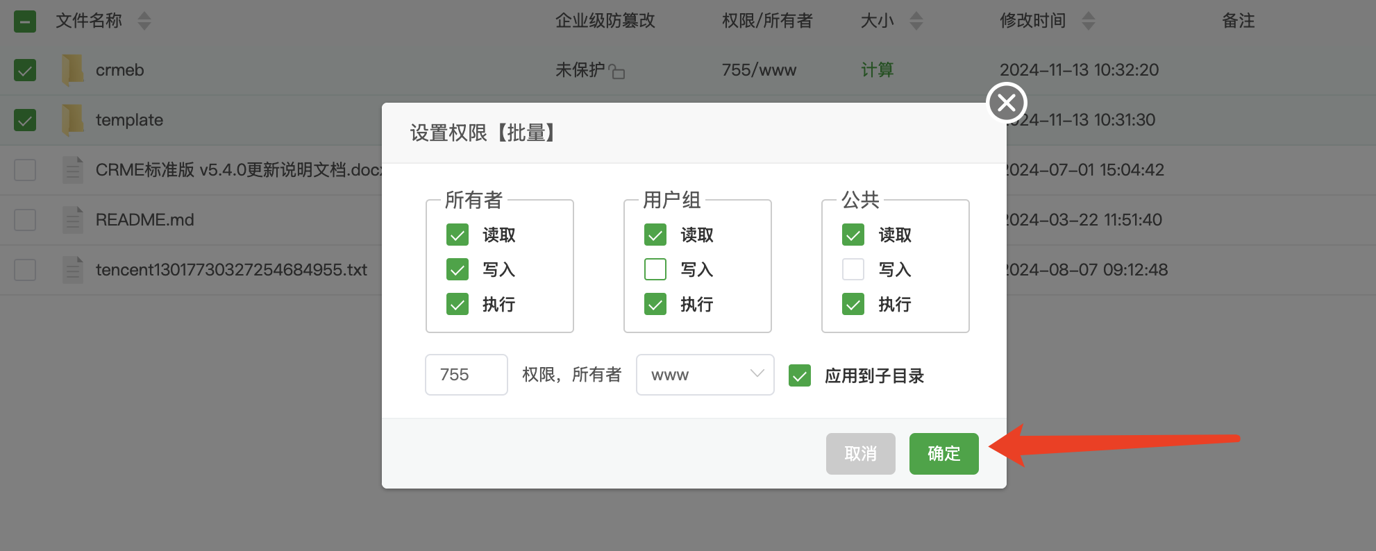 一般为文件权限不对导致的,解决办法如下图,将整个项目文件重新给一遍755 www权限