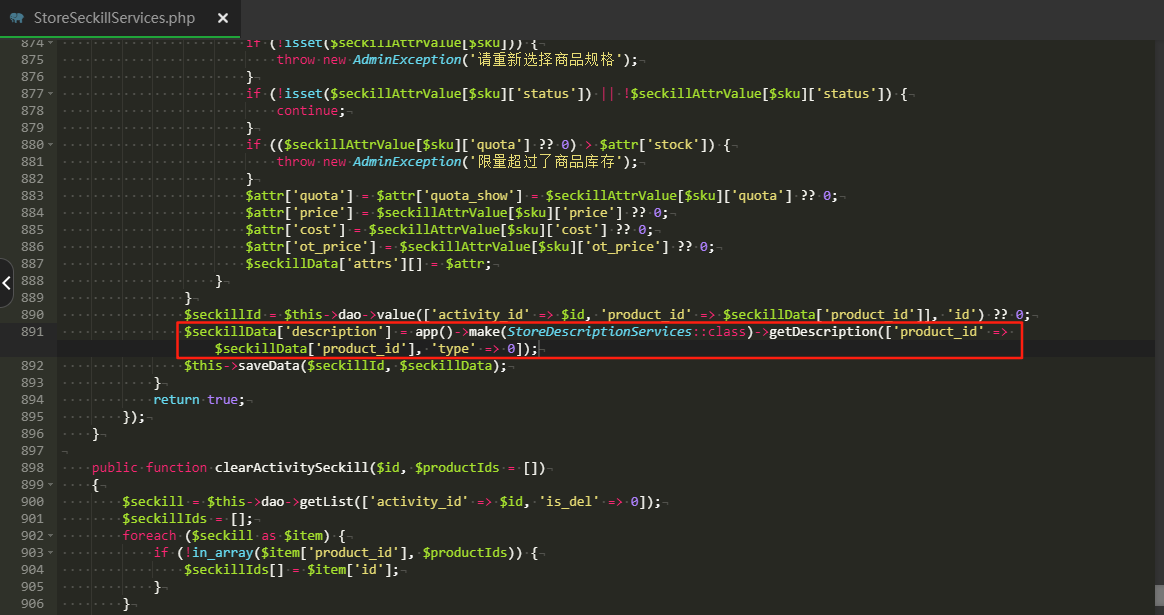 文件地址:crmeb/app/services/activity/seckill/StoreSeckillServices.php 加上如下代码并保存