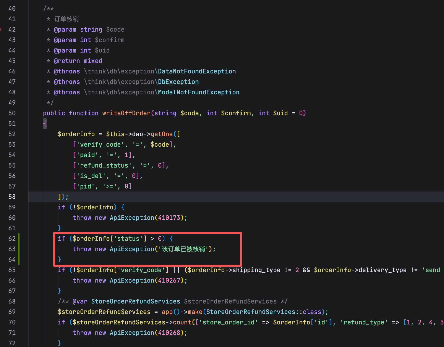 throw new ApiException('该订单已被核销');