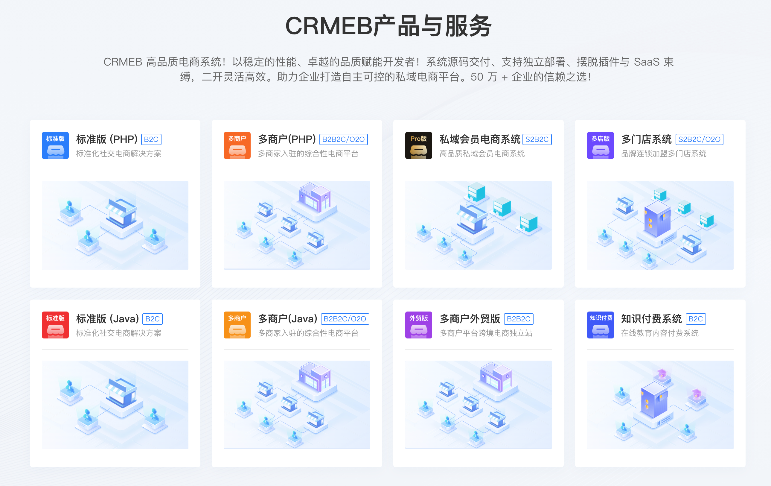 现有产品包含CRMEB开源商城系统、CRMEB标准版商城系统、CRMEB 私域会员电商系统、CRMEB 品牌连锁加盟系统、CRMEB多商户商城系统、CRMEB知识付费系统、CRMEB 外贸多商户商城系统、陀螺匠企业管理系统等系统研发,打磨每一个细节,注重用户体验塑造行业口碑,尽善尽美,悉察客户需求,精益求精,超越客户期待。