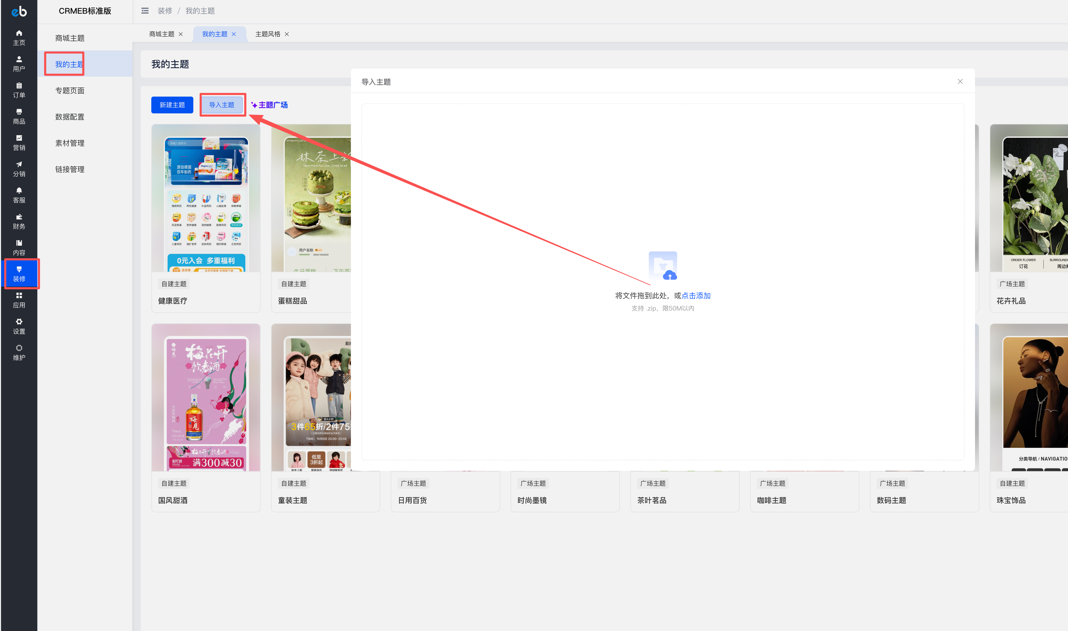下载好主题包后,登录CRMEB开源商城系统/标准版商城系统(php)后台,在装修>我的主题:点击“导入主题” 添加下载好的主题包;