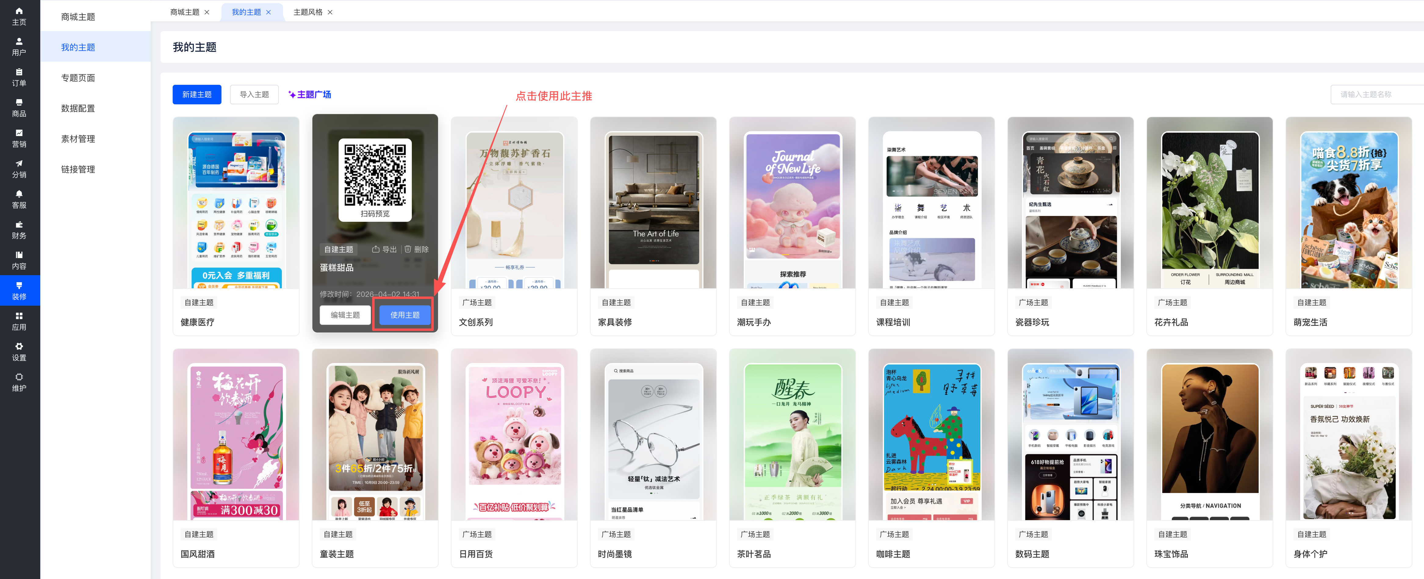 导入成功后,导入的主题将在“我的主题”中展示;点击“使用主题”,商城主题将更换为此主题;也可以对导入的主推进行再次编辑使用;