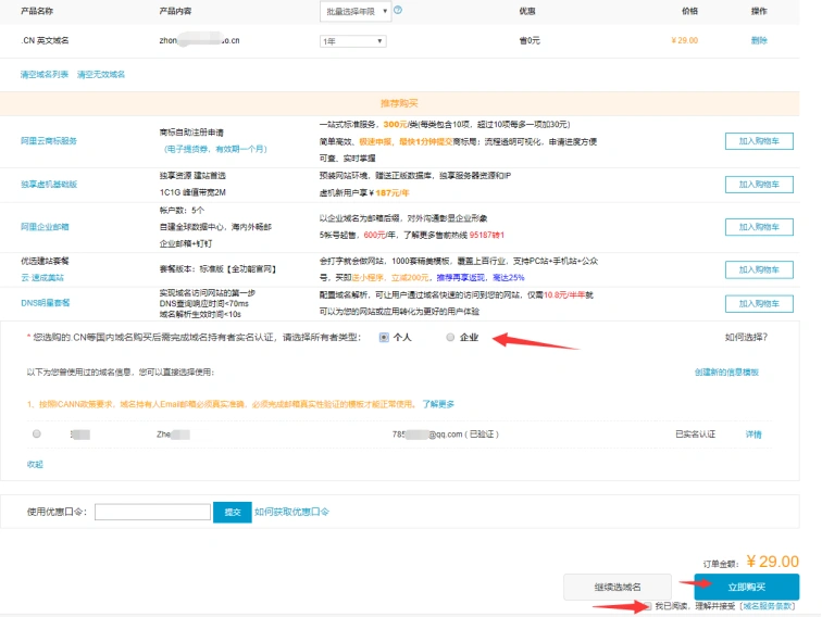 4. 点击【立即购买】。相关认证信息根据类型选择。